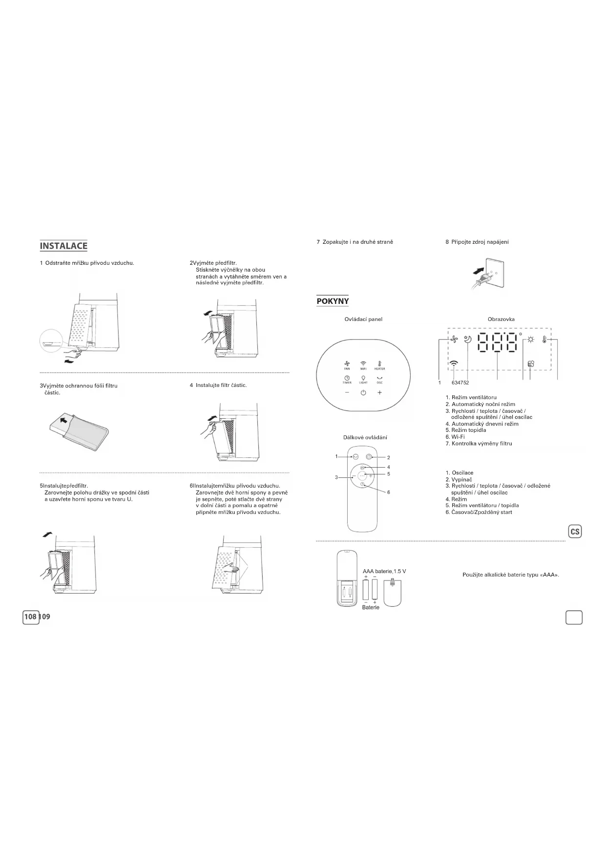 7 Zopakujte ina druhé straně 8 Připojte zdroj napájení POKYNY Ovládací panel Dálkové ovládání Obrazovka