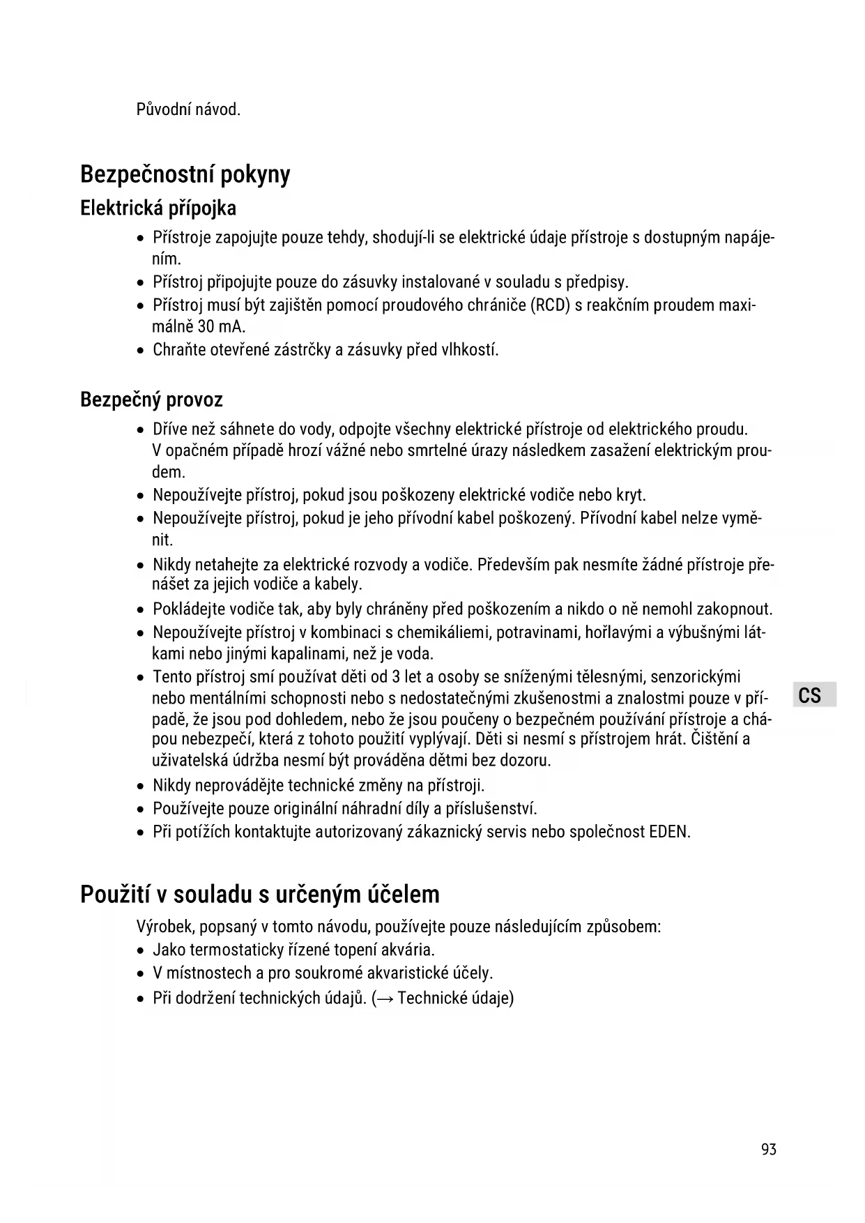 - Při potížích kontaktujte autorizovaný zákaznický servis nebo společnost EDEN. Použití v souladu s určeným účelem Výrobek, popsaný v tomto návodu, používejte pouze následujícím způsobem: