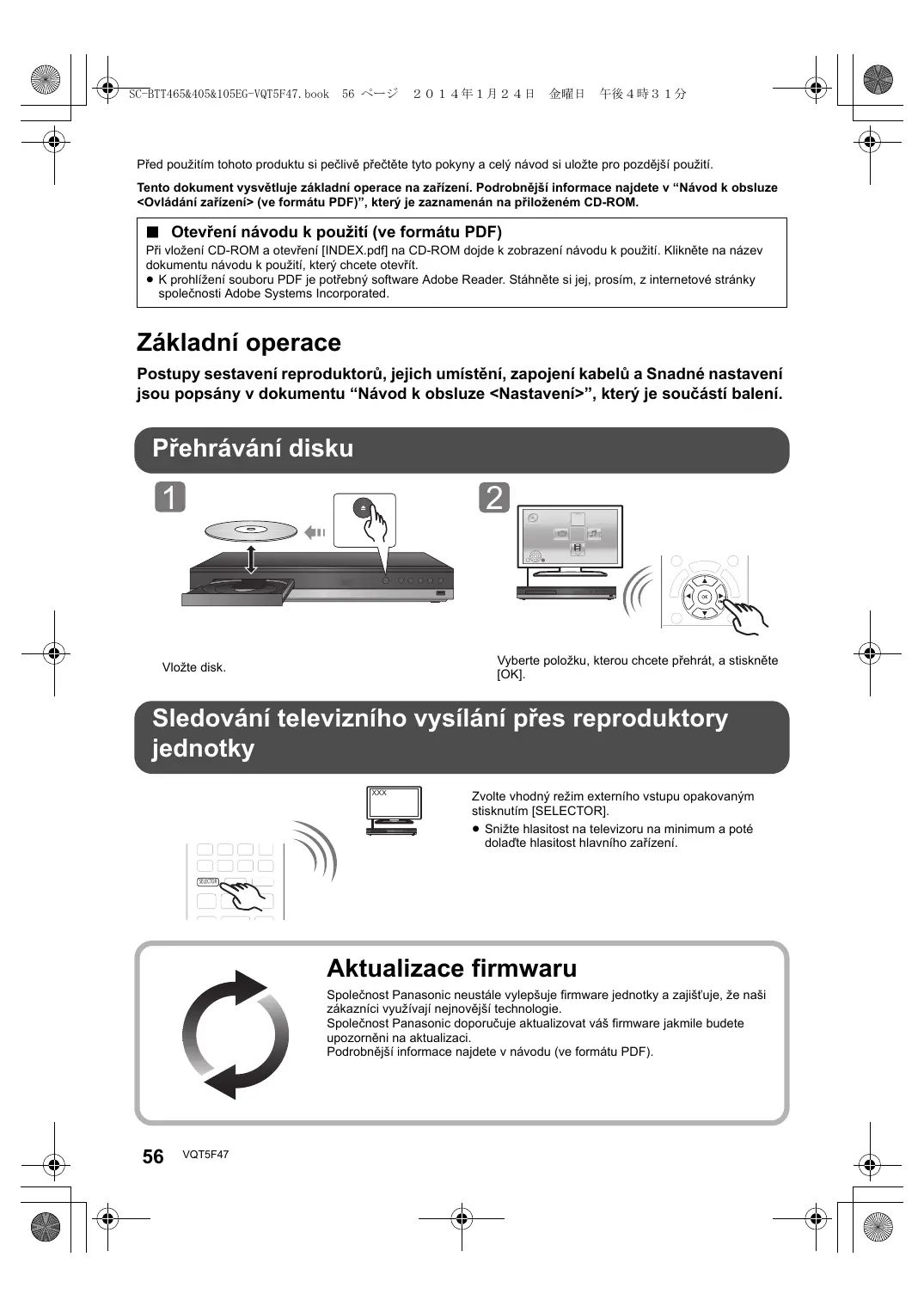 Před použitím tohoto produktu si pečlivě přečtěte tyto pokyny a celý návod si uložte pro pozdější použití. Tento dokument vysvětluje základní operace na zařízení. Podrobnější informace najdete v “Návod k obsluze <Ovládání zařízení> (ve formátu PDF)”, který je zaznamenán na přiloženém CD-ROM. ∫ Otevření návodu k použití (ve formátu PDF) Při vložení CD-ROM a otevření [INDEX.pdf] na CD-ROM dojde k zobrazení návodu k použití. Klikněte na název dokumentu návodu k použití, který chcete otevřít. ≥ K prohlížení souboru PDF je potřebný software Adobe Reader. Stáhněte si jej, prosím, z internetové stránky společnosti Adobe Systems Incorporated. Základní operace Postupy sestavení reproduktorů, jejich umístění, zapojení kabelů a Snadné nastavení jsou popsány v dokumentu “Návod k obsluze <Nastavení>”, který je součástí balení. Přehrávání disku