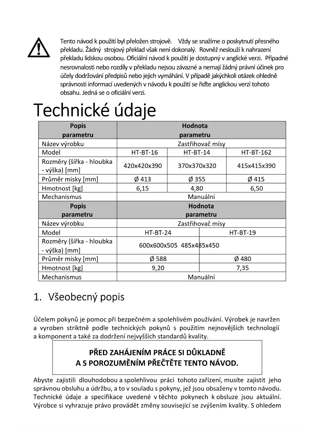 a) Před každým čištěním, a rovněž není-li zařízení používáno, vytáhněte síťovou zástrčku! b) Například v případě listů určených k vaření piva lze k čištění zařízení používat pouze jemné čisticí prostředky určené k čištění povrchů přicházejících do styku s potravinami. c) Po každém čištění všechny části dobře usušte, než budete zařízení znovu používat. d) Zařízení uchovávejte na suchém a chladném místě chráněném před vlhkostí a přímým slunečním zářením. e) Na zařízení nestříkejte vodu ani ho nevkládejte do vody. f) Dejte pozor, aby skrze otvory, které se nacházejí na krytu, nepronikla voda. g) Větrací otvory čistěte štětečkem a stlačeným vzduchem. h) Zařízení pravidelně kontrolujte z hlediska jeho technické funkčnosti a na jakákoli poškození.i) K čistění používejte měkký hadřík. j) Nepoužívejte ostré a/nebo kovové předměty (např. drátěný kartáč nebo kovovou špachtli), protože by mohly poškodit povrch materiálu spotřebiče. k) Nečistěte jednotku kyselými látkami, lékařskými produkty, ředidly, palivem, olejem nebo jinými chemikáliemi, protože to může způsobit poškození zařízení.Caractéristiques techniques Description du paramètre Valeur du paramètre Nom de produit Effeuilleuse Modèle HT-BT-16 HT-BT-14 HT-BT-162 Dimensions (Largeur x Profondeur x Hauteur) [mm] 420x420x390 370x370x320 415x415x390 Diamètre du bol [mm] Ø413 Ø355 Ø415 Poids [kg] 6,15 4,80 6,50 Mécanisme Manuel Description du paramètre Valeur du paramètre Nom de produit Effeuilleuse Modèle HT-BT-24 HT-BT-19 Dimensions (Largeur x Profondeur x Hauteur) [mm] 600x600x505 485x485x450 Diamètre du bol [mm] Ø588 Ø480 Poids [kg] 9,20 7,35 Mécanisme Manuel