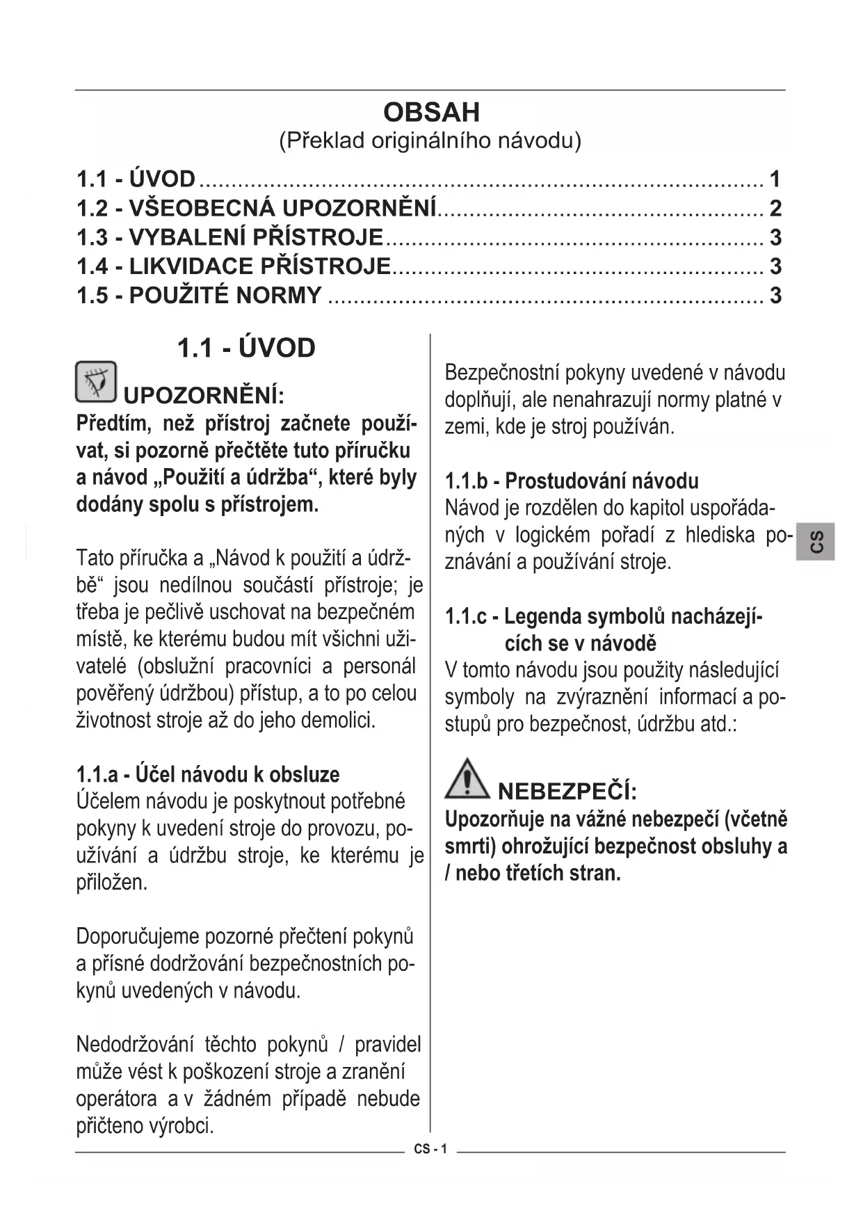 cích se v návodě V tomto návodu jsou použity následující symboly na zvýraznění informací a po- stupů pro bezpečnost, údržbu atd.: NEBEZPEČÍ: Upozorňuje na vážné nebezpečí (včetně smrti) ohrožující bezpečnost obsluhy a / nebo třetích stran. OBSAH (Překlad originálního návodu)
