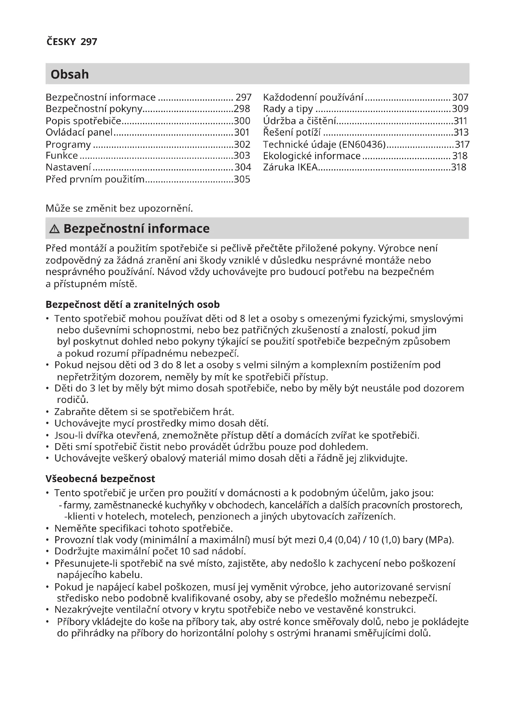 - Příbory vkládejte do koše na příbory tak, aby ostré konce směřovaly dolů, nebo je pokládejte do přihrádky na příbory do horizontální polohy sostrými hranami směřujícími dolů. Bezpečnostní informace ............................. 297 Bezpečnostní pokyny...................................298 Popis spotřebiče ...........................................300 Ovládací panel .............................................. 301 Programy ......................................................302 Funkce ...........................................................303 Nastavení ......................................................304 Před prvním použitím ..................................305 Každodenní používání ................................. 307 Rady atipy ....................................................309 Údržba ačištění.............................................311 Řešení potíží ..................................................313 Technické údaje (EN60436) .......................... 317 Ekologické informace .................................. 318 Záruka IKEA ................................................... 318ČESKY 298