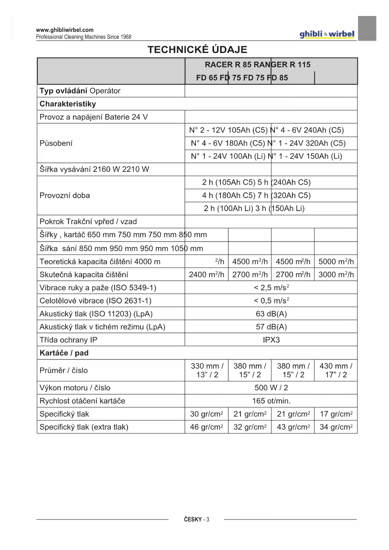 - BATBAT MATMAT PEPE MASMAS EB1 49029600_Manuale RACER_RANGER_8ed_04-2023.indd 2649029600_Manuale RACER_RANGER_8ed_04-2023.indd 26 06/04/2023 15:25:2306/04/2023 15:25:23www.ghibliwirbel.com Professional Cleaning Machines Since 1968 ČESKY - 1 Vážený zákazníku, Děkujeme, že jste si vybrali náš výrobek pro čištění prostředí, ve kterém žijete. Stroj na mytí podlah, který jste si zakoupil, byl navržen tak, aby naplnil představy uži- vatele, pokud jde o snadnost použití a spolehlivost. Jsme si vědomi toho, že dobrý výrobek potřebuje neustále specifické aktualizace, aby si zachoval úroveň kvality a aby odpovídal očekávání každodenních uživatelů. V této souvislosti doufáme, že najdeme ve Vás nejen spokojeného zákazníka, ale i partnera, který nám bude posílat své myšlenky a názory plynoucí z každodenní osobní zkušenosti. 49029600_Manuale RACER_RANGER_8ed_04-2023.indd 149029600_Manuale RACER_RANGER_8ed_04-2023.indd 1 06/04/2023 15:25:2406/04/2023 15:25:24www.ghibliwirbel.com Professional Cleaning Machines Since 1968 ČESKY - 2 INDEX INDEX p. 2