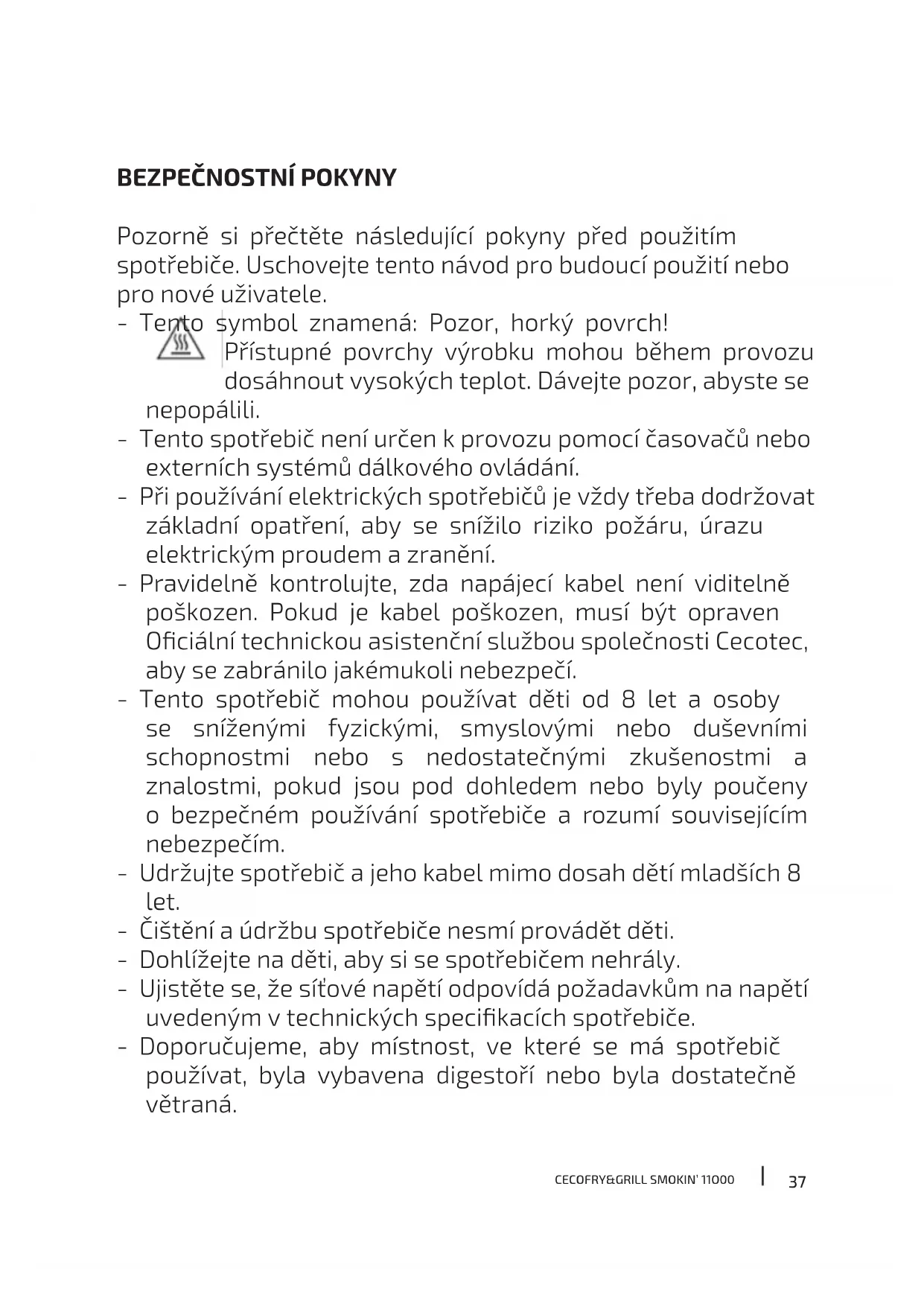 Pozorně si přečtěte následující pokyny před použitím spotřebiče. Uschovejte tento návod pro budoucí použití nebo pro nové uživatele. - Tento symbol znamená: Pozor, horký povrch! Přístupné povrchy výrobku mohou během provozu dosáhnout vysokých teplot. Dávejte pozor, abyste se nepopálili. - Tento spotřebič není určen k provozu pomocí časovačů nebo externích systémů dálkového ovládání. - Při používání elektrických spotřebičů je vždy třeba dodržovat základní opatření, aby se snížilo riziko požáru, úrazu elektrickým proudem a zranění. - Pravidelně kontrolujte, zda napájecí kabel není viditelně poškozen. Pokud je kabel poškozen, musí být opraven Ociální technickou asistenční službou společnosti Cecotec, aby se zabránilo jakémukoli nebezpečí. - Tento spotřebič mohou používat děti od 8 let a osoby se sníženými fyzickými, smyslovými nebo duševními schopnostmi nebo s nedostatečnými zkušenostmi a znalostmi, pokud jsou pod dohledem nebo byly poučeny o bezpečném používání spotřebiče a rozumí souvisejícím nebezpečím. - Udržujte spotřebič a jeho kabel mimo dosah dětí mladších 8 let. - Čištění a údržbu spotřebiče nesmí provádět děti. - Dohlížejte na děti, aby si se spotřebičem nehrály. - Ujistěte se, že síťové napětí odpovídá požadavkům na napětí uvedeným v technických specikacích spotřebiče. - Doporučujeme, aby místnost, ve které se má spotřebič používat, byla vybavena digestoří nebo byla dostatečně větraná.CECOFRY&GRILL SMOKIN’ 11O00