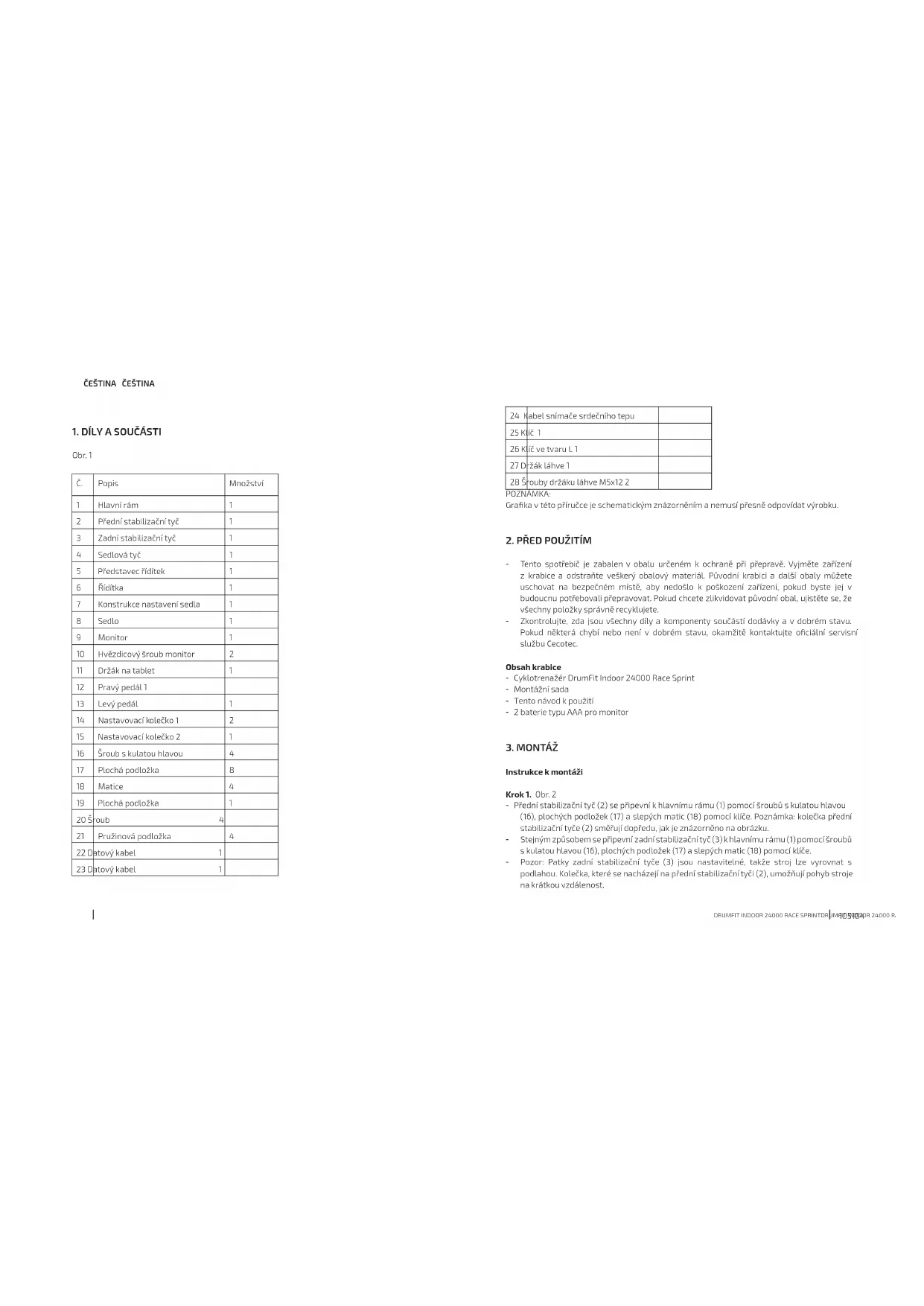 Obr. 1 Č. Popis Množství 1 Hlavní rám 1 2 Přední stabilizační tyč 1 3 Zadní stabilizační tyč 1 4 Sedlová tyč 1 5 Představec řídítek 1 6 Řídítka 1 7 Konstrukce nastavení sedla 1 8 Sedlo 1 9 Monitor 1 10 Hvězdicový šroub monitor 2 11 Držák na tablet 1 12 Pravý pedál 1 13 Levý pedál 1 14 Nastavovací kolečko 1 2 15 Nastavovací kolečko 2 1 16 Šroub s kulatou hlavou 4 17 Plochá podložka 8 18 Matice 4 19 Plochá podložka 1 20 Šroub 4 21 Pružinová podložka 4 22 Datový kabel 1 23 Datový kabel 1DRUMFIT INDOOR 24000 RACE SPRINTDRUMFIT INDOOR 24000 RACE SPRINT