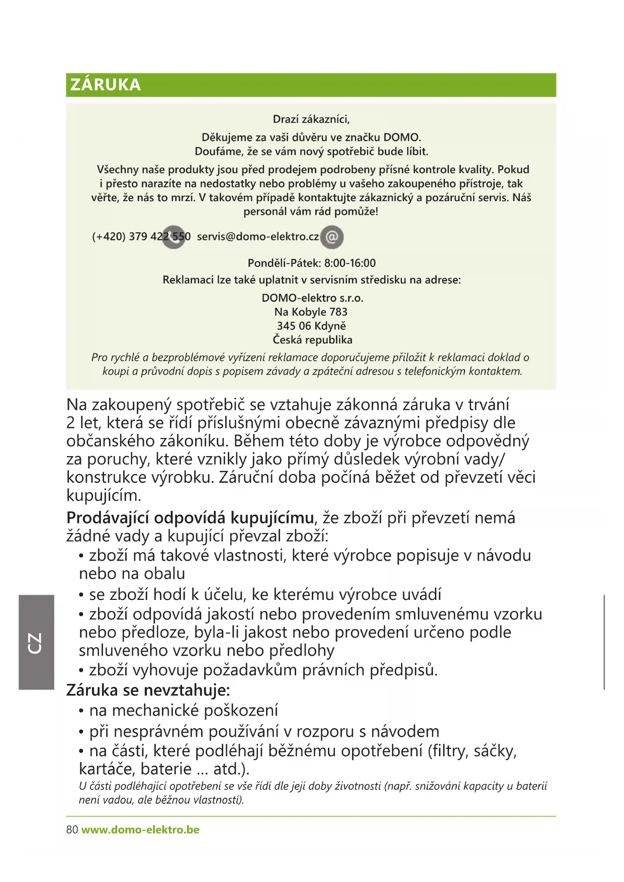 - na části, které podléhají běžnému opotřebení (ltry, sáčky, kartáče, baterie … atd.). U části podléhající opotřebení se vše řídí dle její doby životnosti (např. snižování kapacity u baterií není vadou, ale běžnou vlastností).www.domo-elektro.be 81
