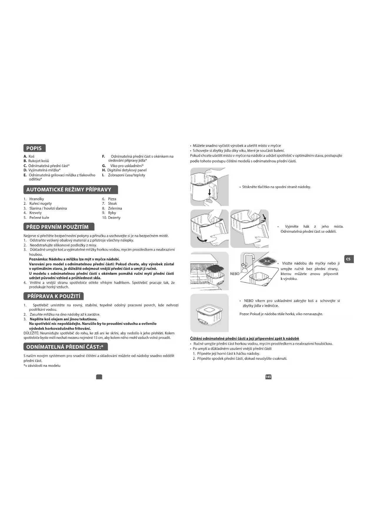 - NEBO víkem pro uskladnění zakryjte koš a schovejte si zbytky jídla vledničce. Pozor: Pokud je nádoba stále horká, víko nenasazujte. POPIS A. Koš B. Rukojet košů C. Odnímatelná přední část* D. Vyjímatelná mřížka* E. Odnímatelná grilovací mřížka z tlakového odlitku* F. Odnímatelná přední část sokénkem na sledování přípravy jídla* G. Víko pro uskladnění* H. Digitální dotykový panel