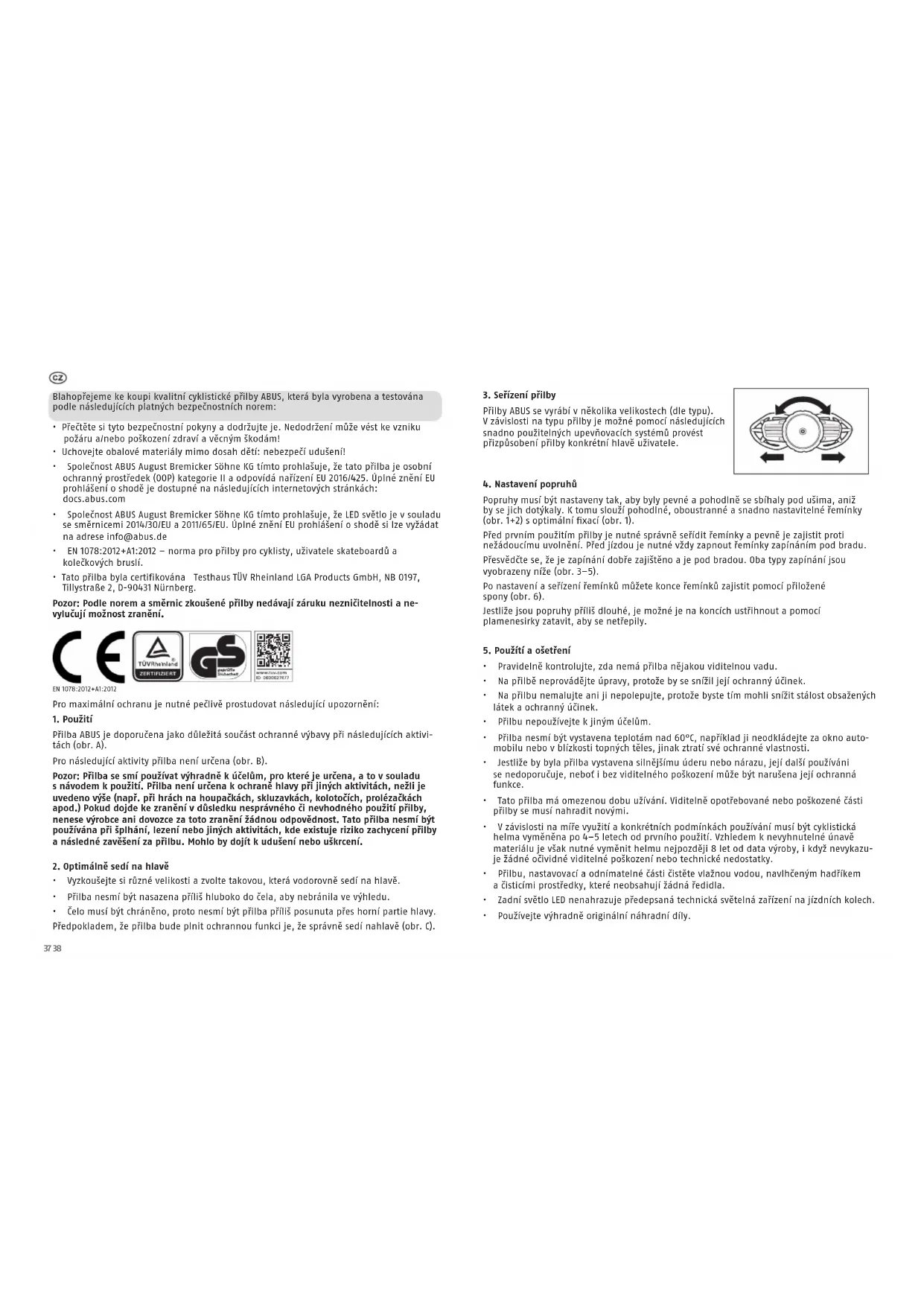 - Společnost ABUS August Bremicker Söhne KG tímto prohlašuje, že tato přilba je osobní ochranný prostředek (OOP) kategorie II a odpovídá nařízení EU 2016/425. Úplné znění EU prohlášení o shodě je dostupné na následujících internetových stránkách: docs.abus.com