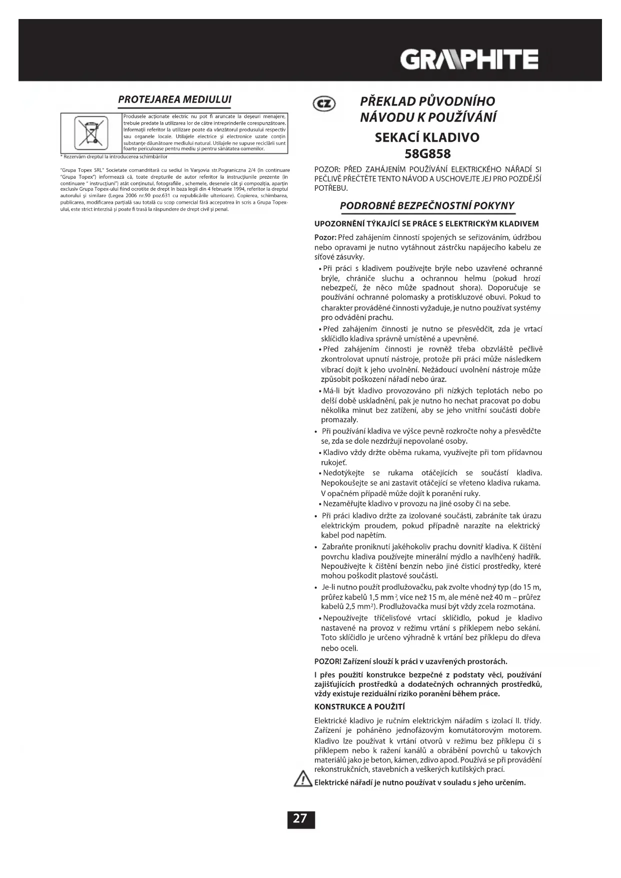 58G858 - Vrtačka Graphite - Bezplatný návod k obsluze