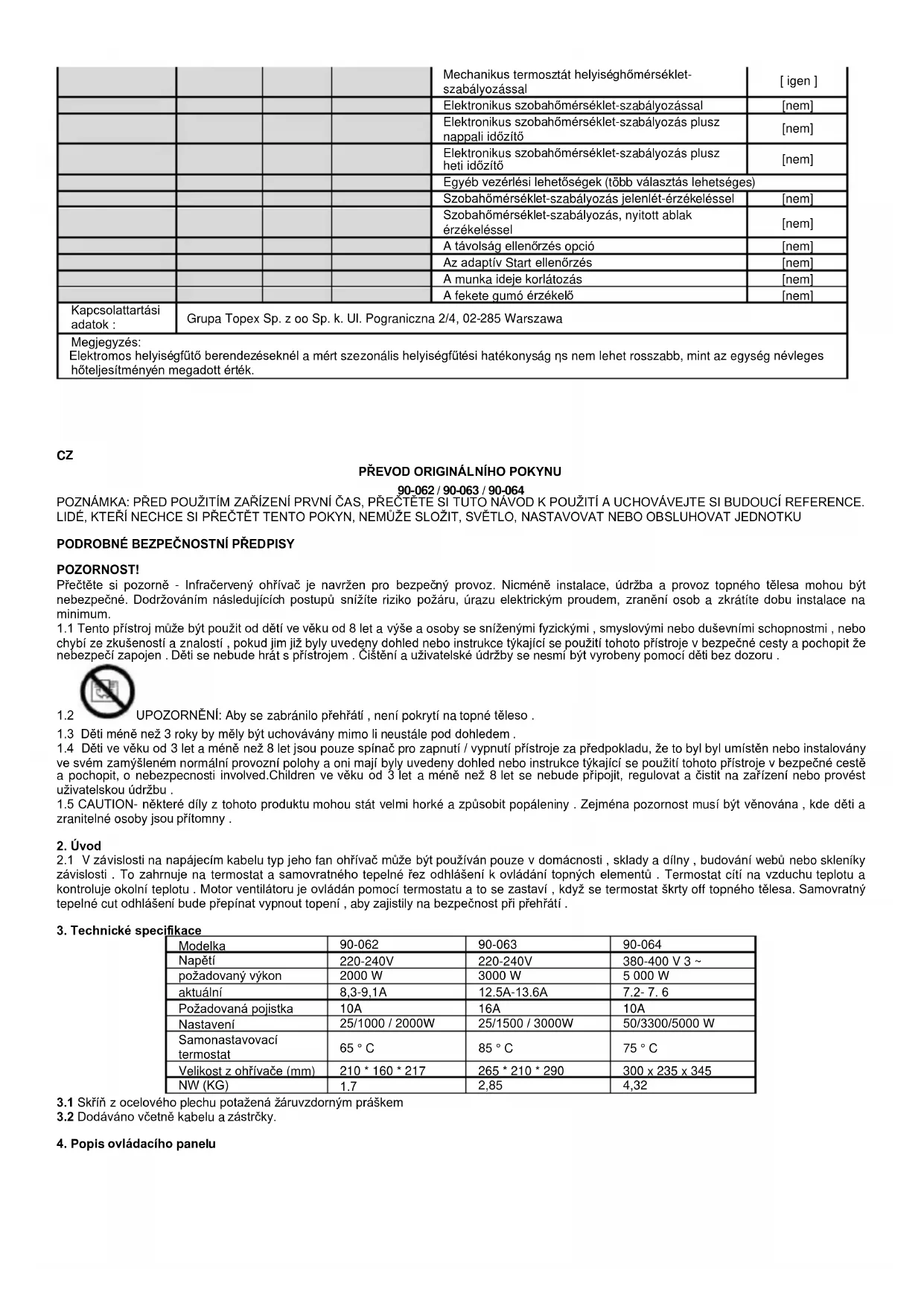 S čidlem černé žárovky [Ne] Kontaktní údaje : Grupa Topex Sp. z oo Sp. k. Ul. Pograniczna 2/4, 02-285 Warszawa Poznámka: U elektrických lokálních ohřívačů prostoru nesmí být měřená energetická účinnost vytápění sezónního prostoru ηs horší než deklarovaná hodnota při jmenovitém tepelném výkonu jednotky.