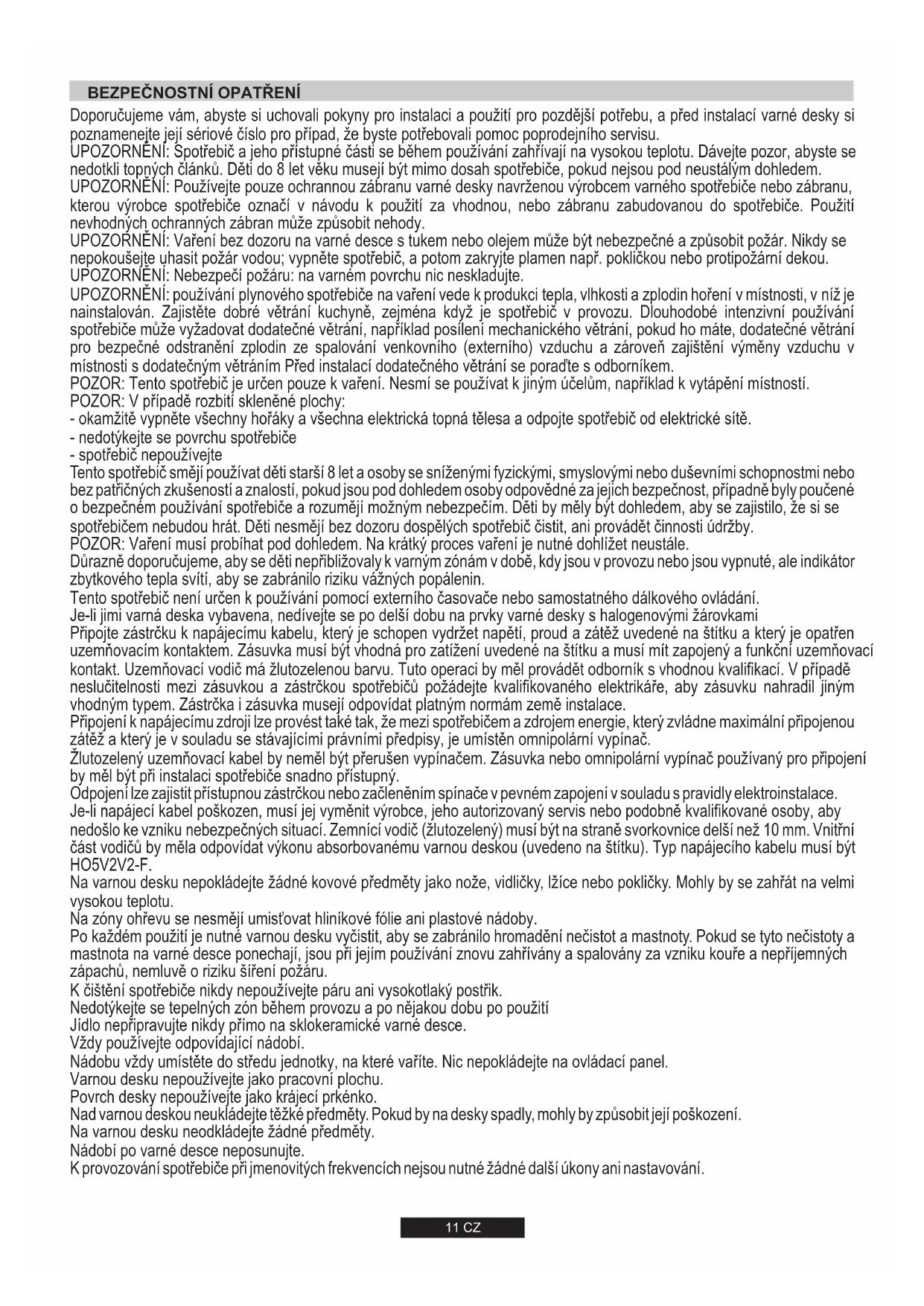 13,15 kW 12,75 kW 1253 l/h 928 g/h 9,65 kW 9,45 kW L'appareil est conforme à la Directive européenne 2009/142/CE (GAD) et à partir du 21/04/2018, à la Réglementation sur les appareils à gaz 2016/426 (GAR).11 CZ Doporučujeme vám, abyste si uchovali pokyny pro instalaci a použití pro pozdější potřebu, a před instalací varné desky si poznamenejte její sériové číslo pro případ, že byste potřebovali pomoc poprodejního servisu. UPOZORNĚNÍ: Spotřebič a jeho přístupné části se během používání zahřívají na vysokou teplotu. Dávejte pozor, abyste se nedotkli topných článků. Děti do 8 let věku musejí být mimo dosah spotřebiče, pokud nejsou pod neustálým dohledem. UPOZORNĚNÍ: Používejte pouze ochrannou zábranu varné desky navrženou výrobcem varného spotřebiče nebo zábranu, kterou výrobce spotřebiče označí v návodu k použití za vhodnou, nebo zábranu zabudovanou do spotřebiče. Použití nevhodných ochranných zábran může způsobit nehody. UPOZORNĚNÍ: Vaření bez dozoru na varné desce s tukem nebo olejem může být nebezpečné a způsobit požár. Nikdy se nepokoušejte uhasit požár vodou; vypněte spotřebič, a potom zakryjte plamen např. pokličkou nebo protipožární dekou. UPOZORNĚNÍ: Nebezpečí požáru: na varném povrchu nic neskladujte. UPOZORNĚNÍ: používání plynového spotřebiče na vaření vede k produkci tepla, vlhkosti a zplodin hoření v místnosti, v níž je nainstalován. Zajistěte dobré větrání kuchyně, zejména když je spotřebič v provozu. Dlouhodobé intenzivní používání spotřebiče může vyžadovat dodatečné větrání, například posílení mechanického větrání, pokud ho máte, dodatečné větrání pro bezpečné odstranění zplodin ze spalování venkovního (externího) vzduchu a zároveň zajištění výměny vzduchu v místnosti s dodatečným větráním Před instalací dodatečného větrání se poraďte s odborníkem. POZOR: Tento spotřebič je určen pouze k vaření. Nesmí se používat k jiným účelům, například k vytápění místností. POZOR: V případě rozbití skleněné plochy: - okamžitě vypněte všechny hořáky a všechna elektrická topná tělesa a odpojte spotřebič od elektrické sítě. - nedotýkejte se povrchu spotřebiče - spotřebič nepoužívejte Tento spotřebič smějí používat děti starší 8 let a osoby se sníženými fyzickými, smyslovými nebo duševními schopnostmi nebo bez patřičných zkušeností a znalostí, pokud jsou pod dohledem osoby odpovědné za jejich bezpečnost, případně byly poučené o bezpečném používání spotřebiče a rozumějí možným nebezpečím. Děti by měly být dohledem, aby se zajistilo, že si se spotřebičem nebudou hrát. Děti nesmějí bez dozoru dospělých spotřebič čistit, ani provádět činnosti údržby. POZOR: Vaření musí probíhat pod dohledem. Na krátký proces vaření je nutné dohlížet neustále. Důrazně doporučujeme, aby se děti nepřibližovaly k varným zónám v době, kdy jsou v provozu nebo jsou vypnuté, ale indikátor zbytkového tepla svítí, aby se zabránilo riziku vážných popálenin. Tento spotřebič není určen k používání pomocí externího časovače nebo samostatného dálkového ovládání. Je-li jimi varná deska vybavena, nedívejte se po delší dobu na prvky varné desky s halogenovými žárovkami Připojte zástrčku k napájecímu kabelu, který je schopen vydržet napětí, proud a zátěž uvedené na štítku a který je opatřen uzemňovacím kontaktem. Zásuvka musí být vhodná pro zatížení uvedené na štítku a musí mít zapojený a funkční uzemňovací kontakt. Uzemňovací vodič má žlutozelenou barvu. Tuto operaci by měl provádět odborník s vhodnou kvalifikací. V případě neslučitelnosti mezi zásuvkou a zástrčkou spotřebičů požádejte kvalifikovaného elektrikáře, aby zásuvku nahradil jiným vhodným typem. Zástrčka i zásuvka musejí odpovídat platným normám země instalace. Připojení k napájecímu zdroji lze provést také tak, že mezi spotřebičem a zdrojem energie, který zvládne maximální připojenou zátěž a který je v souladu se stávajícími právními předpisy, je umístěn omnipolární vypínač. Žlutozelený uzemňovací kabel by neměl být přerušen vypínačem. Zásuvka nebo omnipolární vypínač používaný pro připojení by měl být při instalaci spotřebiče snadno přístupný. Odpojení lze zajistit přístupnou zástrčkou nebo začleněním spínače v pevném zapojení v souladu s pravidly elektroinstalace. Je-li napájecí kabel poškozen, musí jej vyměnit výrobce, jeho autorizovaný servis nebo podobně kvalifikované osoby, aby nedošlo ke vzniku nebezpečných situací. Zemnící vodič (žlutozelený) musí být na straně svorkovnice delší než 10 mm. Vnitřní část vodičů by měla odpovídat výkonu absorbovanému varnou deskou (uvedeno na štítku). Typ napájecího kabelu musí být HO5V2V2-F. Na varnou desku nepokládejte žádné kovové předměty jako nože, vidličky, lžíce nebo pokličky. Mohly by se zahřát na velmi vysokou teplotu. Na zóny ohřevu se nesmějí umisťovat hliníkové fólie ani plastové nádoby. Po každém použití je nutné varnou desku vyčistit, aby se zabránilo hromadění nečistot a mastnoty. Pokud se tyto nečistoty a mastnota na varné desce ponechají, jsou při jejím používání znovu zahřívány a spalovány za vzniku kouře a nepříjemných zápachů, nemluvě o riziku šíření požáru. K čištění spotřebiče nikdy nepoužívejte páru ani vysokotlaký postřik. Nedotýkejte se tepelných zón během provozu a po nějakou dobu po použití Jídlo nepřipravujte nikdy přímo na sklokeramické varné desce. Vždy používejte odpovídající nádobí. Nádobu vždy umístěte do středu jednotky, na které vaříte. Nic nepokládejt