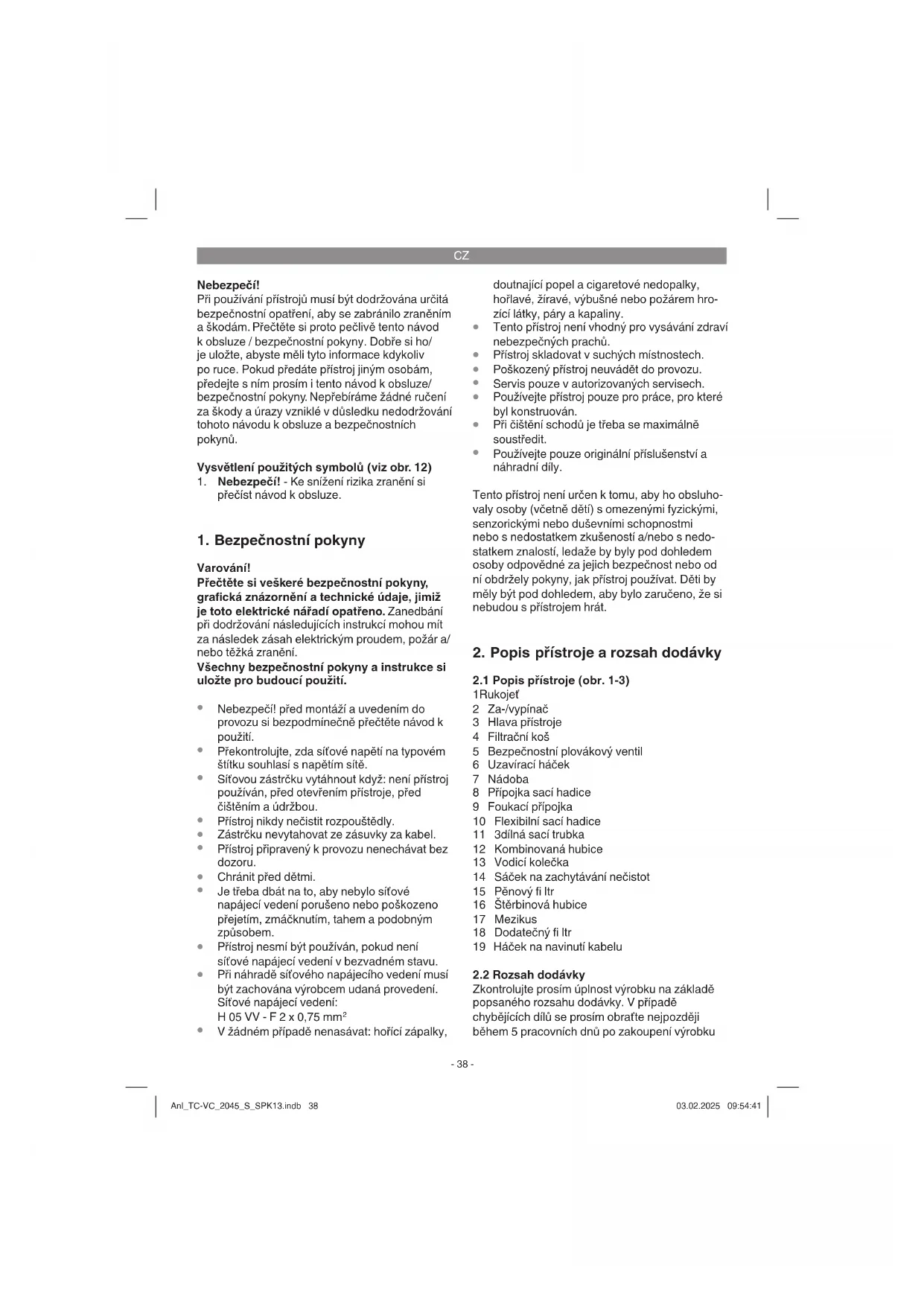 Zkontrolujte prosím úplnost výrobku na základě popsaného rozsahu dodávky. V případě chybějících dílů se prosím obraťte nejpozději během 5 pracovních dnů po zakoupení výrobku Anl_TC-VC_2045_S_SPK13.indb 38Anl_TC-VC_2045_S_SPK13.indb 38 03.02.2025 09:54:4103.02.2025 09:54:41CZ