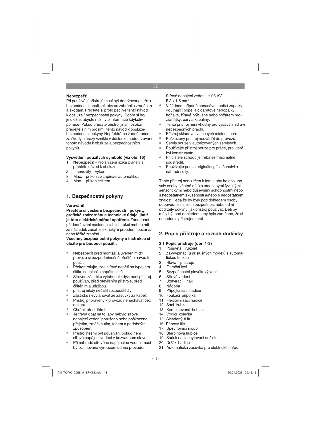 Upozornění! Vysavač pro vysávání za mokra i za sucha nikdy nepoužívejte bez fi ltrů! Vždy dbejte na správné upevnění fi ltrů! Anl_TC-VC_3055_A_SPK13.indb 44Anl_TC-VC_3055_A_SPK13.indb 44 20.01.2025 09:48:1620.01.2025 09:48:16CZ