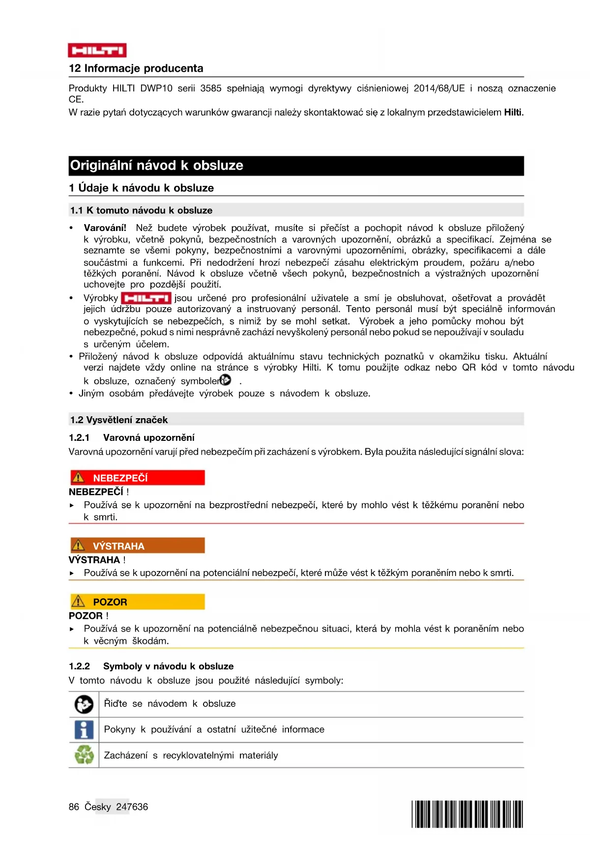 V tomto návodu k obsluze jsou použité následující symboly: Řiďte se návodem k obsluze Pokyny k používání a ostatní užitečné informace Zacházení s recyklovatelnými materiály*247636* 247636 Česky 87 Elektrická zařízení a akumulátory nevyhazujte do směsného odpadu Hilti Lithium-iontový akumulátor Nabíječka Hilti