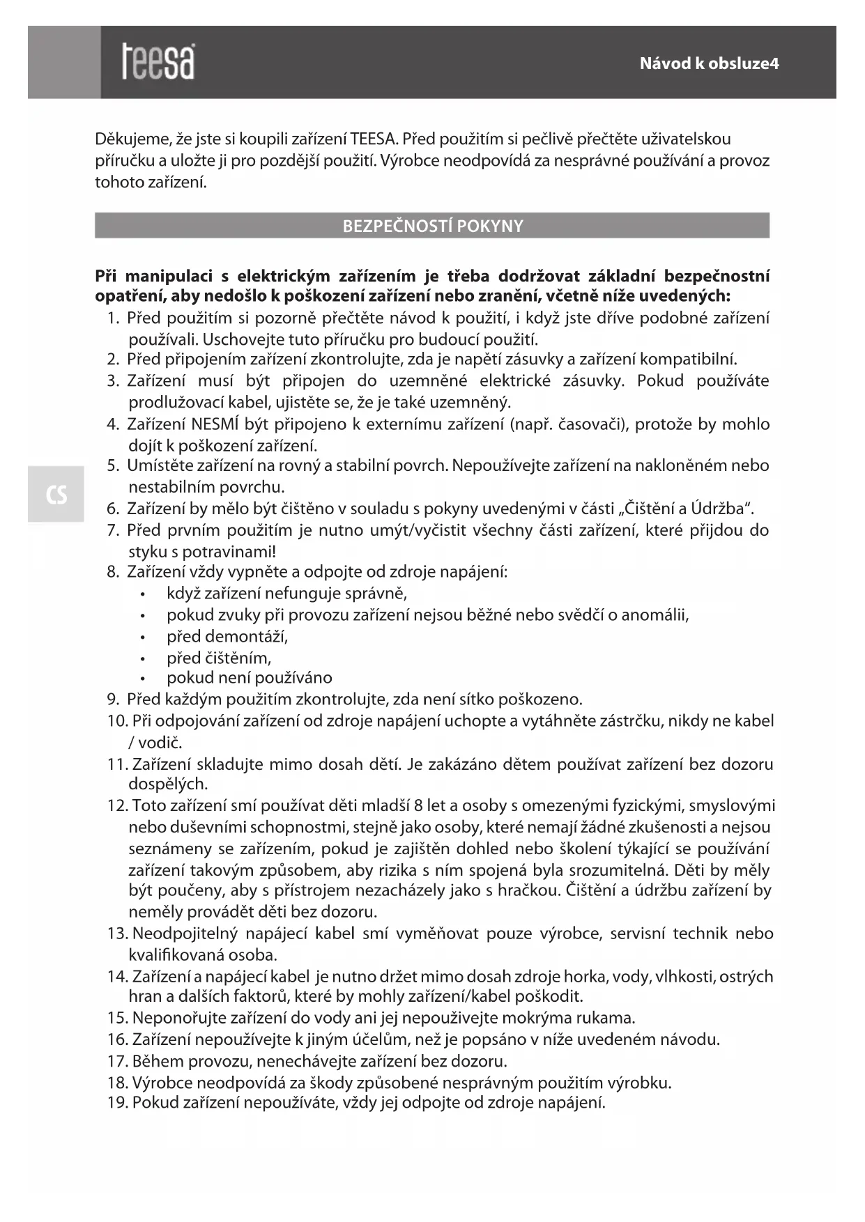 Dekujeme, ze jste si koupili zařizení TEESA. Pred použitím si pečlivě prěctěte uživatelskou príručku a uložte ji pro pozdější použití. Vyrobce neodpovídá za nesprávné používání a provoz tohoto zařizení.