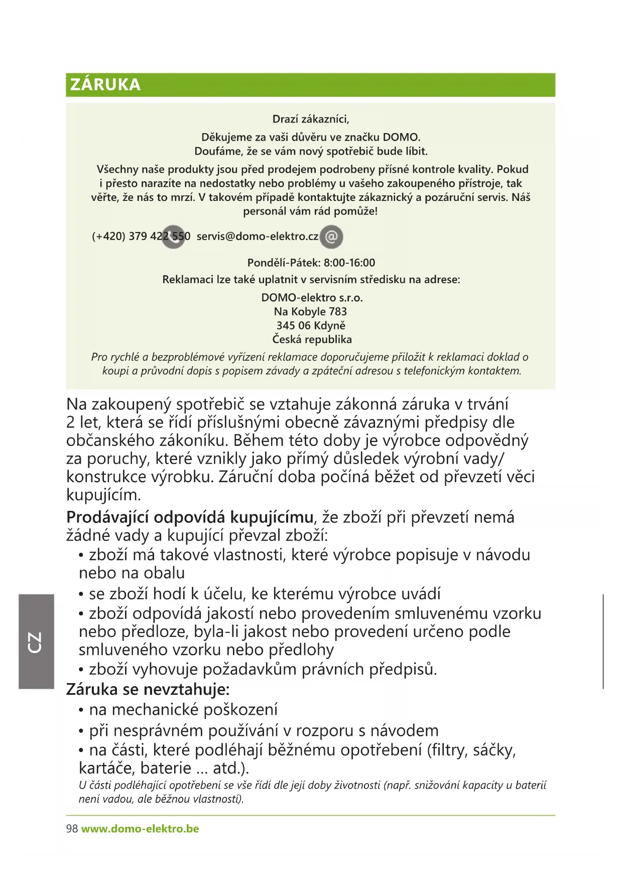 ZÁRUKA Drazí zákazníci, Děkujeme za vaši důvěru ve značku DOMO. Doufáme, že se vám nový spotřebič bude líbit. Všechny naše produkty jsou před prodejem podrobeny přísné kontrole kvality. Pokud i přesto narazíte na nedostatky nebo problémy u vašeho zakoupeného přístroje, tak věřte, že nás to mrzí. V takovém případě kontaktujte zákaznický a pozáruční servis. Náš personál vám rád pomůže! (+420) 379 422 550 servis@domo-elektro.cz Pondělí-Pátek: 8:00-16:00 Reklamaci lze také uplatnit v servisním středisku na adrese: DOMO-elektro s.r.o. Na Kobyle 783 345 06 Kdyně Česká republika Pro rychlé a bezproblémové vyřízení reklamace doporučujeme přiložit k reklamaci doklad o koupi a průvodní dopis s popisem závady a zpáteční adresou s telefonickým kontaktem. Na zakoupený spotřebič se vztahuje zákonná záruka v trvání 2 let, která se řídí příslušnými obecně závaznými předpisy dle občanského zákoníku. Během této doby je výrobce odpovědný za poruchy, které vznikly jako přímý důsledek výrobní vady/ konstrukce výrobku. Záruční doba počíná běžet od převzetí věci kupujícím. Prodávající odpovídá kupujícímu, že zboží při převzetí nemá žádné vady a kupující převzal zboží: