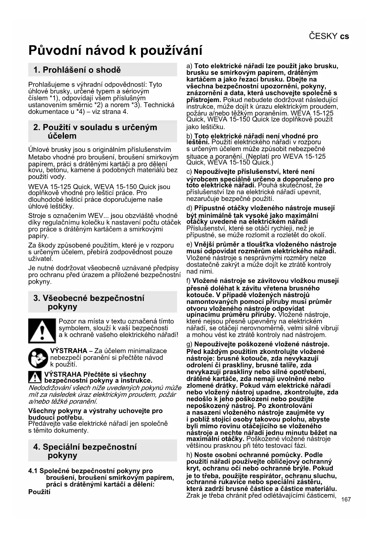 Původní návod k používání Prohlašujeme s výhradní odpovědností: Tyto úhlové brusky, určené typem a sériovým číslem *1), odpovídají všem příslušným ustanovením směrnic *2) a norem *3). Technická dokumentace u *4) – viz strana 4. Úhlové brusky jsou s originálním příslušenstvím Metabo vhodné pro broušení, broušení smirkovým papírem, práci s drátěnými kartáči a pro dělení kovu, betonu, kamene a podobných materiálů bez použití vody. WEVA 15-125 Quick, WEVA 15-150 Quick jsou doplňkově vhodné pro lešticí práce. Pro dlouhodobé lešticí práce doporučujeme naše úhlové leštičky. Stroje s označením WEV... jsou obzvláště vhodné díky regulačnímu kolečku k nastavení počtu otáček pro práce s drátěným kartáčem a smirkovými papíry. Za škody způsobené použitím, které je v rozporu s určeným účelem, přebírá zodpovědnost pouze uživatel. Je nutné dodržovat všeobecně uznávané předpisy pro ochranu před úrazem a přiložené bezpečnostní pokyny. Pozor na místa v textu označená tímto symbolem, slouží k vaší bezpečnosti a k ochraně vašeho elektrického nářadí! VÝSTRAHA – Za účelem minimalizace nebezpečí poranění si přečtěte návod k použití. VÝSTRAHA Přečtěte si všechny bezpečnostní pokyny a instrukce. Nedodržování všech níže uvedených pokynů může mít za následek úraz elektrickým proudem, požár a/nebo těžké poranění. Všechny pokyny a výstrahy uchovejte pro budoucí potřebu. Předávejte vaše elektrické nářadí jen společně s těmito dokumenty.