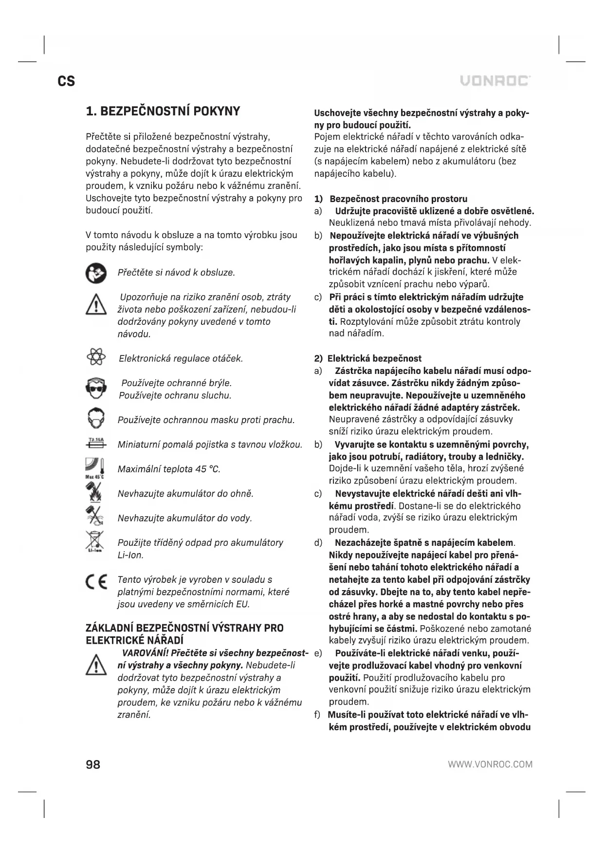 Poškozená a likvidovaná elektrická nebo elektronická zařízení musí být odevzdána ve sběrných dvorech, které jsou určeny pro tento účel. Pouze pro země EU Nevyhazujte elektrická nářadí do běžného domácí- ho odpadu. Podle evropské směrnice 2012/19/EC týkající se likvidace elektrických a elektronických zařízení a její implementace do vnitrostátního práva, musí být nepoužívaná elektrická nářadí shro- mažďována odděleně a jejich likvidace musíbýt provedena tak, aby nedošlo k ohrožení životního prostředí. ZÁRUKA Výrobky VONROC jsou vyvíjeny v souladu s poža- davky norem na nejvyšší kvalitu a je zaručeno, že po dobu platné záruky, která začíná běžet dnem původního nákupu, nebudou na těchto výrob- cích žádné vady materiálu, ani vady způsobené špatným dílenským zpracováním. Dojde-li během tohoto období k závadě v důsledku vady materiálu nebo dílenského zpracování, kontaktujte přímo firmuVONROC. Z této záruky jsou vyloučeny následující případy:
