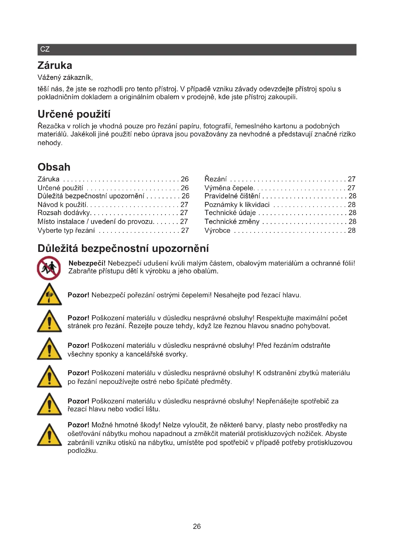 - Záruka Vážený zákazník, těší nás, že jste se rozhodli pro tento přístroj. V případě vzniku závady odevzdejte přístroj spolu s pokladničním dokladem a originálním obalem v prodejně, kde jste přístroj zakoupili. Určené použití Řezačka v rolích je vhodná pouze pro řezání papíru, fotograí, řemeslného kartonu a podobných materiálů. Jakékoli jiné použití nebo úprava jsou považovány za nevhodné a představují značné riziko nehody. Obsah Záruka p. 26