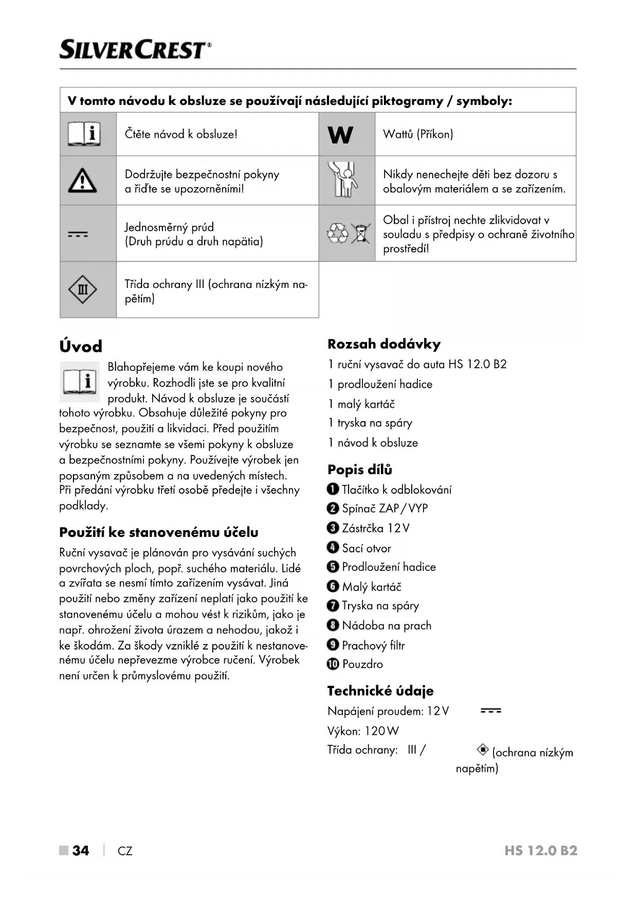 CZ Úvod Blahopřejeme vám ke koupi nového výrobku. Rozhodli jste se pro kvalitní produkt. Návod kobsluze je součástí tohoto výrobku. Obsahuje důležité pokyny pro bezpečnost, použití a likvidaci. Před použitím výrobku se seznamte se všemi pokyny k obsluze a bezpečnostními pokyny. Používejte výrobek jen popsaným způsobem a na uvedených místech. Při předání výrobku třetí osobě předejte i všechny podklady. Použití ke stanovenému účelu Ruční vysavač je plánován pro vysávání suchých povrchových ploch, popř . suchého materiálu. Lidé a zvířata se nesmí tímto zařízením vysávat. Jiná použití nebo změny zařízení neplatí jako použití ke stanovenému účelu a mohou vést k rizikům, jako je např. ohrožení života úrazem a nehodou, jakož i ke škodám. Za škody vzniklé z použití k nestanove- nému účelu nepřevezme výrobce ručení. Výrobek není určen k průmyslovému použití. Rozsah dodávky 1 ruční vysavač do auta HS 12 .0 B2 1 prodloužení hadice 1 malý kartáč 1 tryska na spáry 1 návod kobsluze Popis dílů Tlačítko k odblokování Spínač ZAP / VYP Zástrčka 12 V Sací otvor Prodloužení hadice Malý kartáč Tryska na spáry Nádoba na prach Prachový filtr Pouzdro Technické údaje Napájení proudem: 12 V Výkon: 120 W Třída ochrany: III / (ochrana nízkým napětím) V tomto návodu k obsluze se používají následující piktogramy / symboly: Čtěte návod k obsluze!