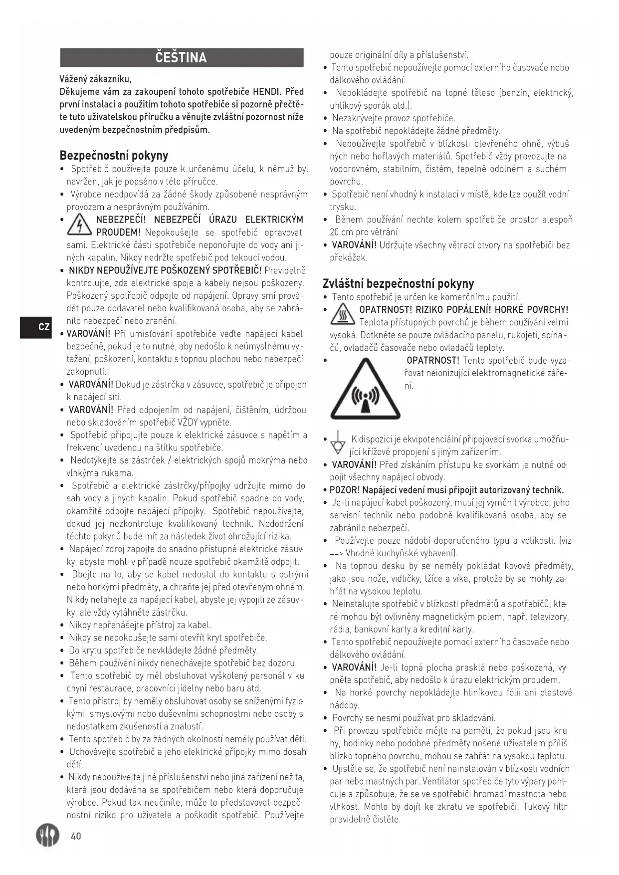 ČEŠTINA Vážený zákazníku, Děkujeme vám za zakoupení tohoto spotřebiče HENDI. Před první instalací a použitím tohoto spotřebiče si pozorně přečtě