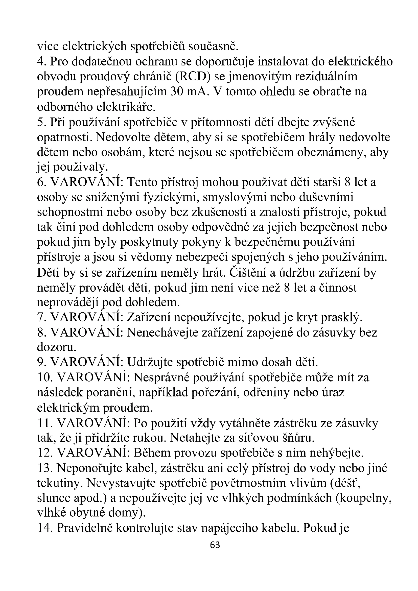 50-60 Hz. Pro zvýšení bezpečnosti používání nepřipojujte k jednomu obvodu63 více elektrických spotřebičů současně.