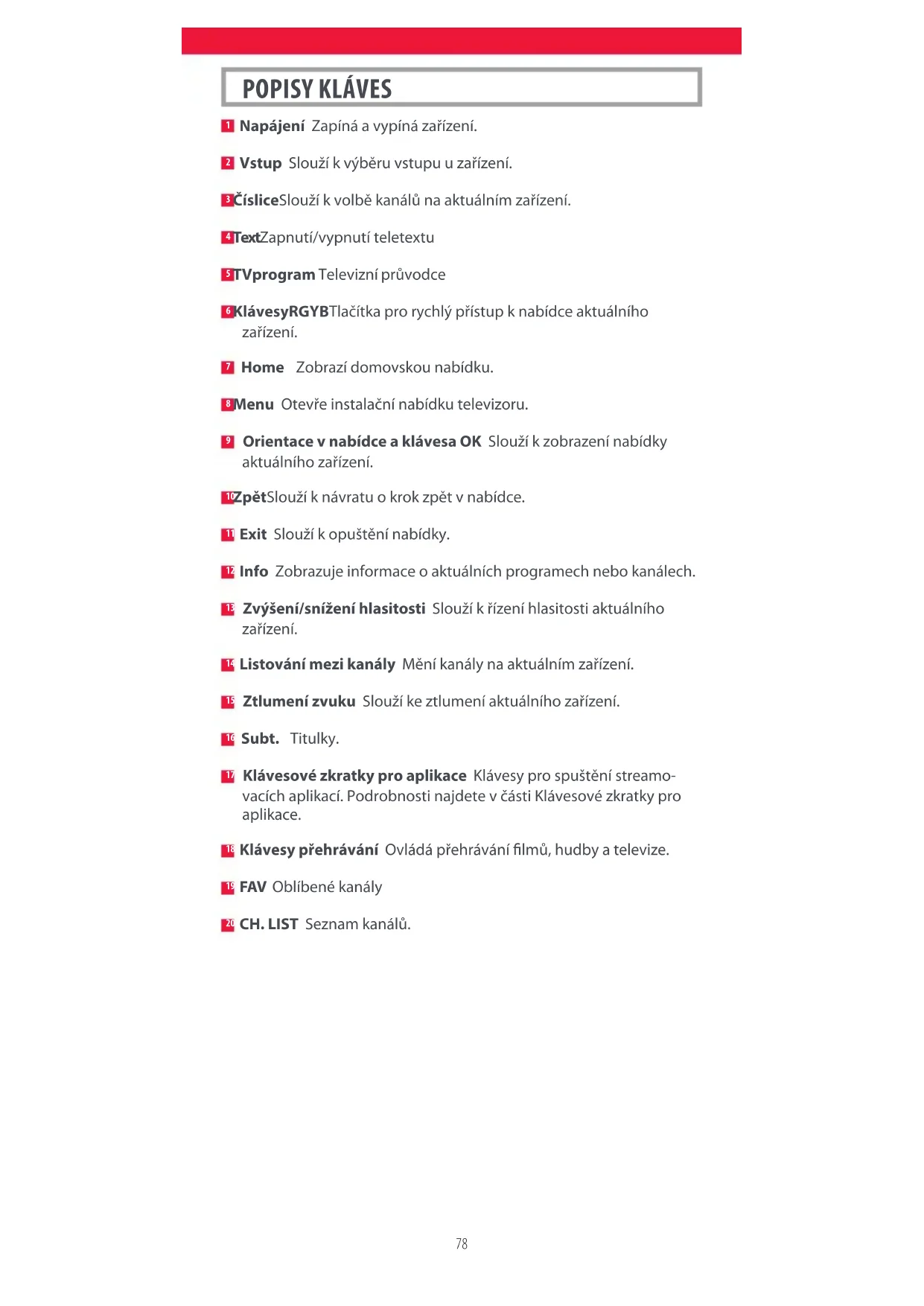 Klávesové zkratky pro aplikace Klávesy pro spuštění streamo- vacích aplikací. Podrobnosti najdete v části Klávesové zkratky pro aplikace.