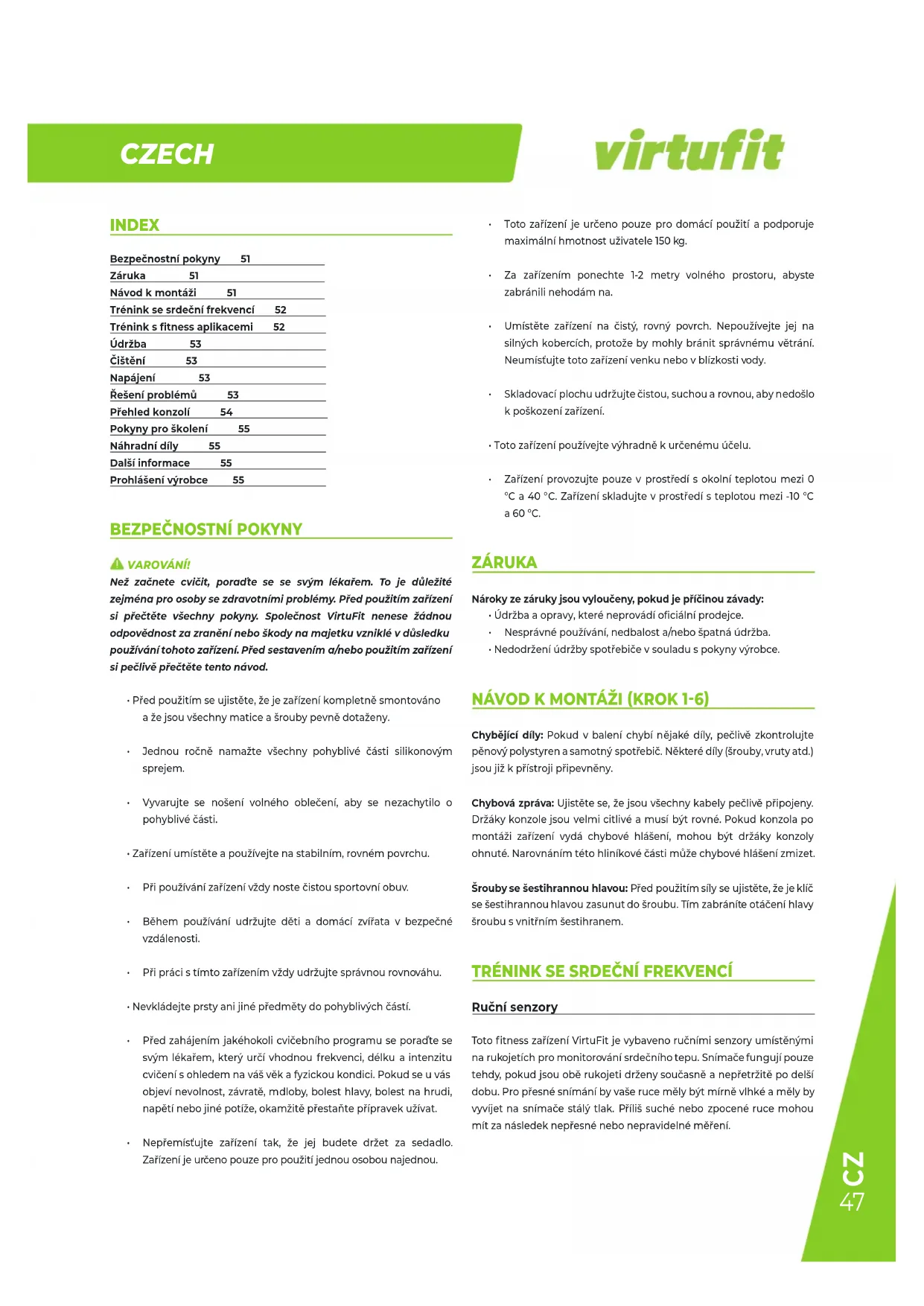 INDEX Bezpečnostnípokyny 51Záruka 51Návodkmontáži 51Tréninksesrdečnífrekvencí 52Tréninksfitnessaplikacemi 52Údržba 53Čištění 53Napájení 53Řešeníproblémů 53Přehledkonzolí 54Pokynyproškolení 55Náhradnídíly 55Dalšíinformace 55Prohlášenívýrobce 55