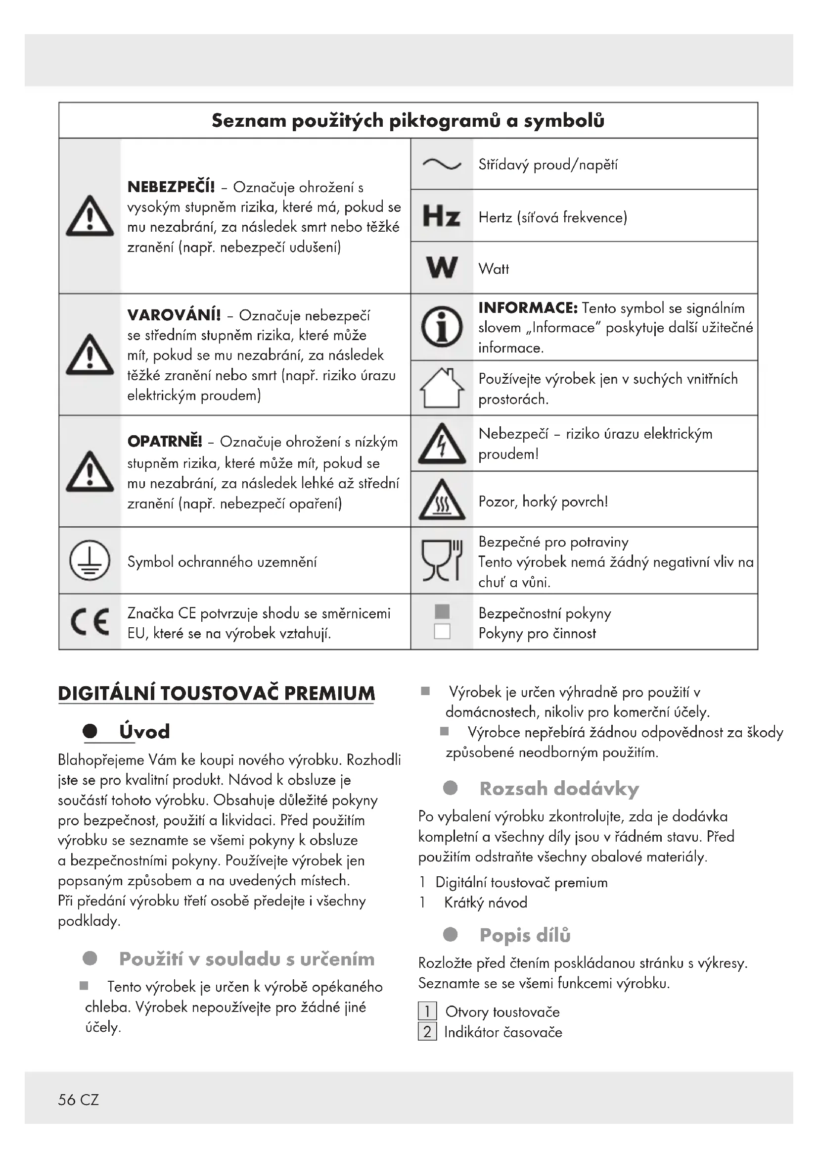 Úvod Blahopřejeme Vám ke koupi nového výrobku. Rozhodli jste se pro kvalitní produkt. Návod k obsluze je součástí tohoto výrobku. Obsahuje důležité pokyny pro bezpečnost, použití a likvidaci. Před použitím výrobku se seznamte se všemi pokyny k obsluze a bezpečnostními pokyny. Používejte výrobek jen popsaným způsobem a na uvedených místech. Při předání výrobku třetí osobě předejte i všechny podklady. Použití v souladu s určením Tento výrobek je určen k výrobě opékaného chleba. Výrobek nepoužívejte pro žádné jiné účely. Výrobek je určen výhradně pro použití v domácnostech, nikoliv pro komerční účely. Výrobce nepřebírá žádnou odpovědnost za škody způsobené neodborným použitím. Rozsah dodávky Po vybalení výrobku zkontrolujte, zda je dodávka kompletní a všechny díly jsou v řádném stavu. Před použitím odstraňte všechny obalové materiály. 1 Digitální toustovač premium 1 Krátký návod Popis dílů Rozložte před čtením poskládanou stránku s výkresy. Seznamte se se všemi funkcemi výrobku. [1] Otvory toustovače [2] Indikátor časovače57CZ [3] – (tlačítko snížení stupně zhnědnutí) [4] + (tlačítko zvýšení stupně zhnědnutí) [5] (rozmrazovací tlačítko se světelnou indikací) [6] (tlačítko Stop) [7] (ohřívací tlačítko se světelnou indikací) [8] Nástavec na rohlíky [9] Nožky stojánku [] Návin vedení [] Svorka vedení [] Přípojné vedení se síťovou zástrčkou [] Zásuvka na drobky [] Vyklápěcí páka (pro nástavec na rohlíky) [] Indikátor úrovně zhnědnutí [] Spouštěcí páka Technické údaje Vstupní napětí: 220–240V∼, 50–60Hz Příkon: 730–870W Příkon ve vypnutém stavu: 0,2W Ochranná třída: I Certifikace: GS (TÜVRheinland) Bezpečnostní pokyny SEZNAMTE SE PŘED POUŽITÍM
