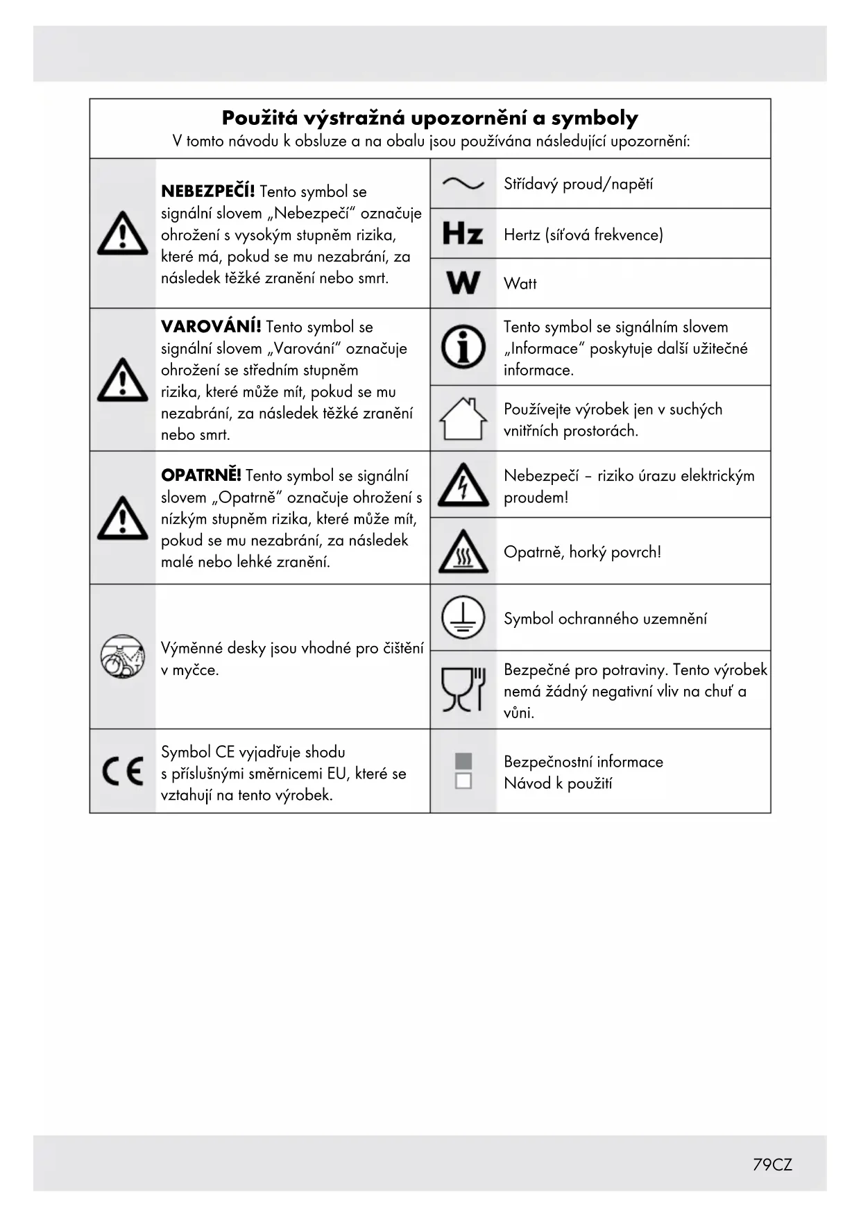 ZRANĚNÍ A POŠKOZENÍ! Nenechávejte výrobek bez dozoru, když je připojen k síti. Výrobkem nepohybujte, pokud je v provozu. Nepoužívejte výrobek bez vložených výměnných desek. Nestavte výrobek na horké povrchy (plynový sporák, elektrický sporák, trouba atd.). Používejte výrobek na rovné, stabilní, čisté, tepelně odolné a suché ploše. Výrobek nezakrývejte, pokud je v používání nebo krátce po používání, dokud je ještě teplý. Dbejte na to, aby přípojné vedení nebylo sevřeno výměnnými deskami nebo aby nebylo v kontaktu s hranami desek. Používání prodlužovacích vedení se nedoporučuje. Pokud je však použití prodlužovacího vedení nezbytné, musí být určeno pro proud nejméně 10A. Přívodní kabel a prodlužovací vedení položte tak, aby o něj nikdo nemohl zakopnout ani aby se nemohlo nic poškodit.83CZ Tento výrobek není určen k tomu, aby byl používán s externím časovačem nebo samostatným systémem dálkového ovládání. Nevytahujte síťovou zástrčku ze zásuvky za přípojné vedení. Chraňte výrobek, přípojné vedení a síťovou zástrčku před prachem, přímým slunečním zářením, kapající a stříkající vodě. Chraňte výrobek proti horku. Nepokládejte výrobek do blízkosti otevřených plamenů nebo zdrojů tepla, jako jsou kamna nebo ohřívače.