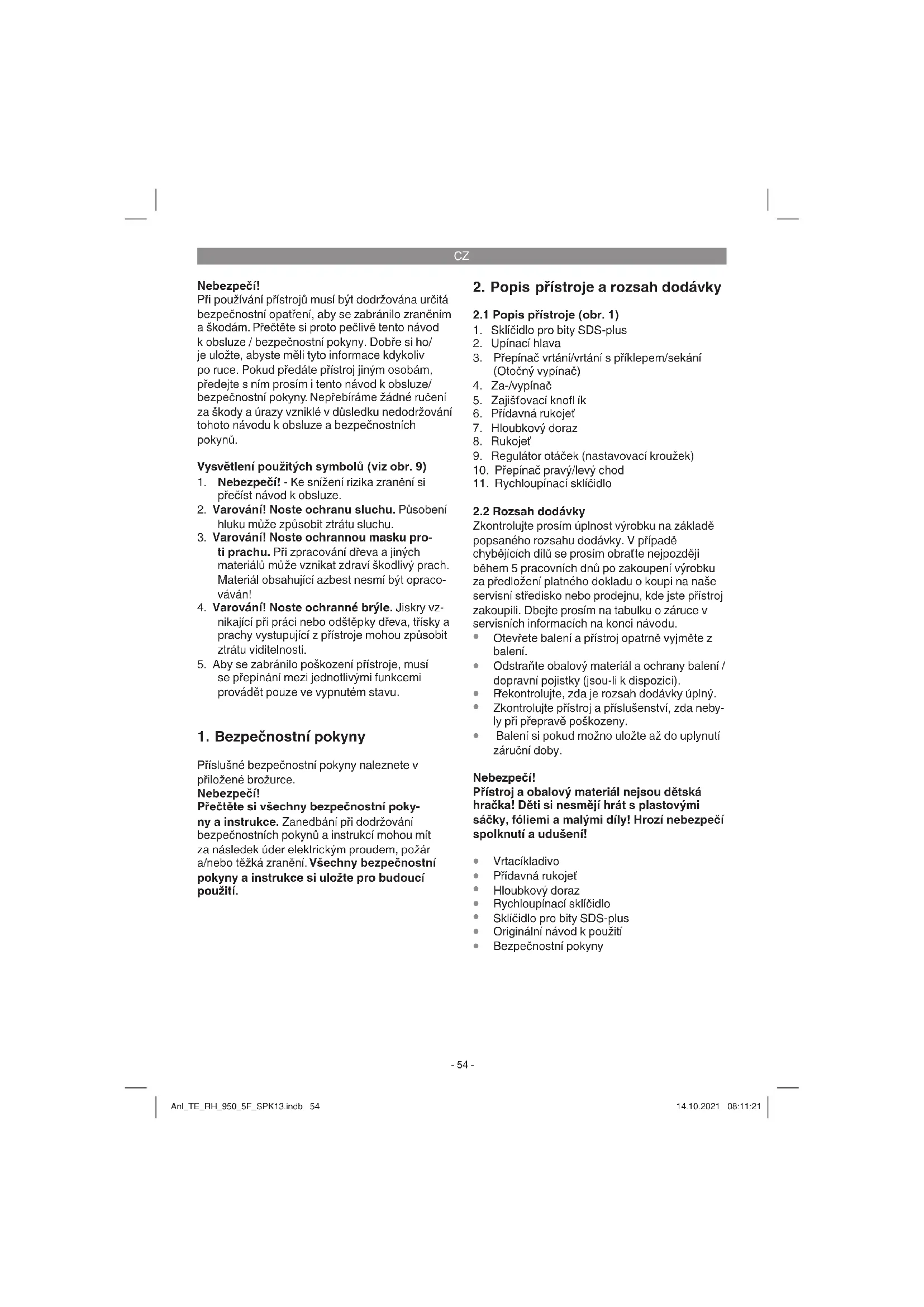 vedení Nebezpečí! Pokud je síťové napájecí vedení poškozeno, musí být nahrazeno výrobcem nebo jeho zákaznickým servisem nebo kvalifi kovanou osobou, aby se zabránilo nebezpečím. Anl_TE_RH_950_5F_SPK13.indb 57Anl_TE_RH_950_5F_SPK13.indb 57 14.10.2021 08:11:2214.10.2021 08:11:22CZ