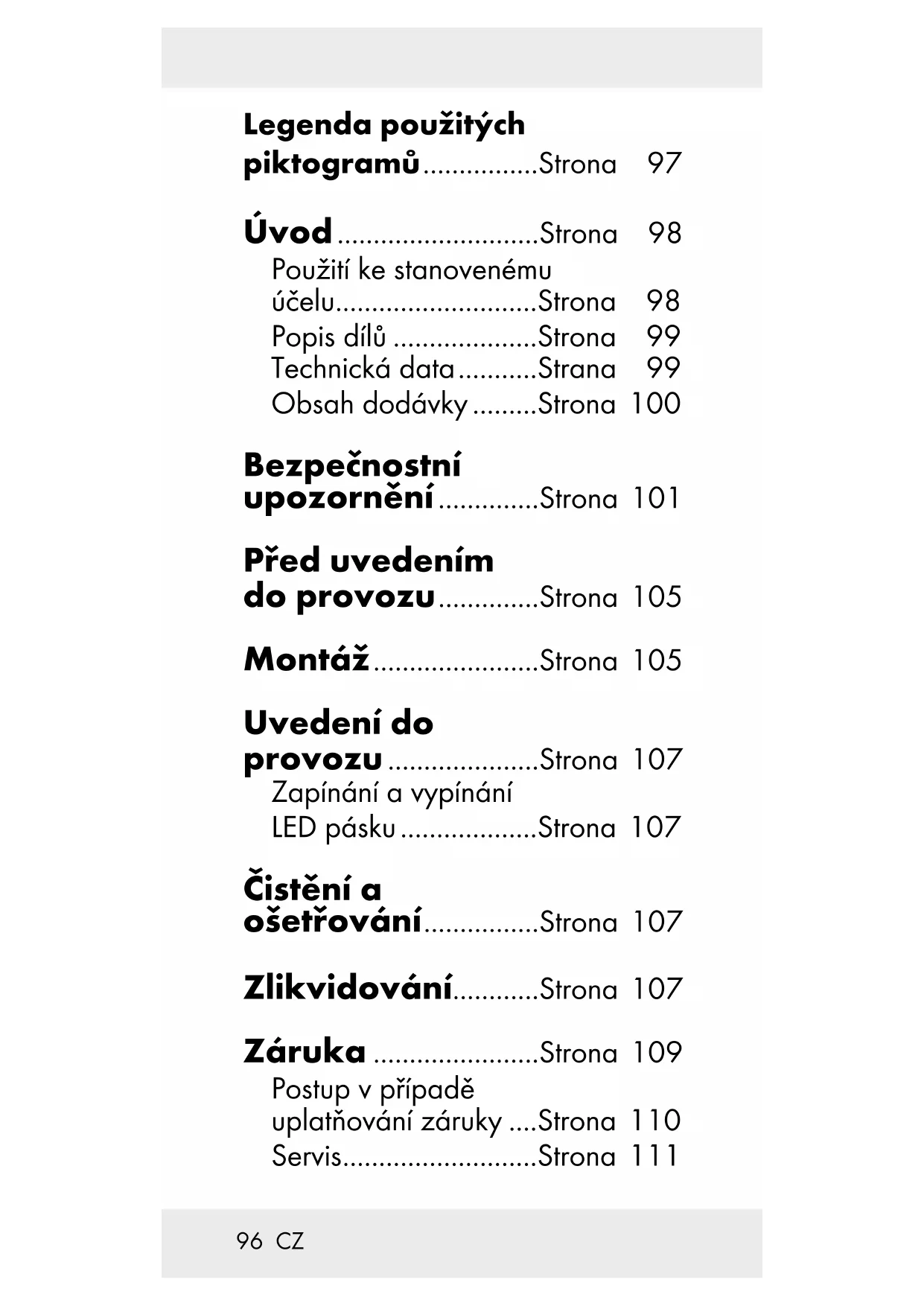 Nepoužívejte výrobek, pokud je přikrytý předměty nebo vsazený do nějakého povrchu. Připojujte výrobek pouze pomocí dodaného spojovacího kabelu. Otevřené konce musejí být uza- vřeny dříve, než budete moci výrobek použít. Nespojujte tento výrobek spáskou LED jiného výrobce. Vezměte na vědomí, že pokud je zástrčkový síťový adaptér v zásuvce, odebírá výrobek i mimo provoz malé množství proudu. K úplnému vypnutí, vytáhněte zá- strčkový síťový adaptér ze zásuvky. Osvětlovací prostředky nelze vyměnit. Po výpadku nebo poškození osvětlovacích prostředků se musí celý výrobek vyměnit. Nepoužívejte LED pásek přikrytý předměty nebo vsazený do nějakého povrchu. Spojení se provádí jen dodanými konektory. Otevřené konce se musí před použitím izolovat.105 CZ Nespojujte LED pásek s výrobkem jiného výrobce. Před uvedením do provozu NEBEZPEČÍ