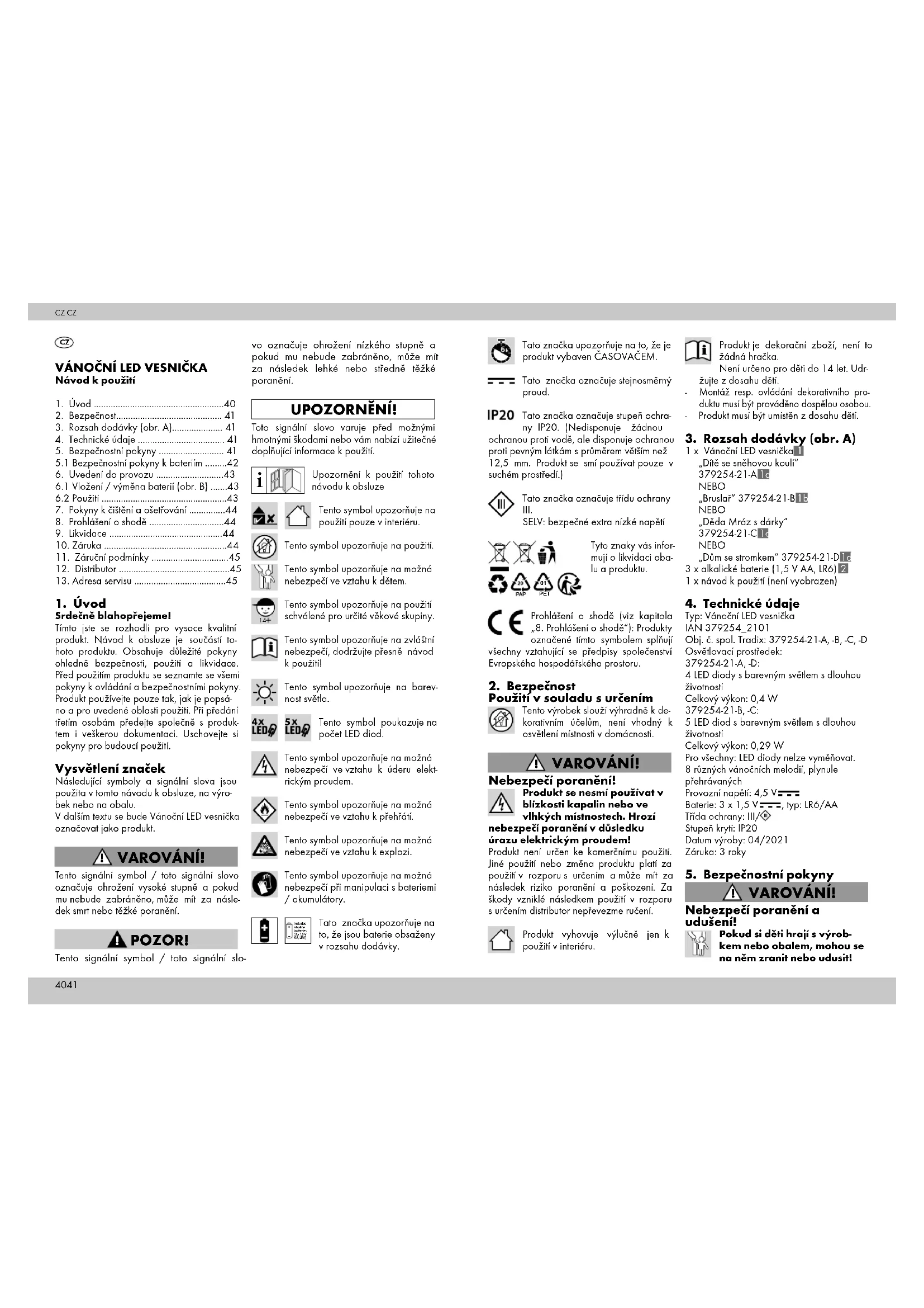 Typ: Vánoční LED vesnička IAN 379254_2101 Obj. č. spol. Tradix: 379254-21-A, -B, -C, -D Osvětlovací prostředek: 379254-21-A, -D: 4 LED diody s barevným světlem s dlouhou životností Celkový výkon: 0,4 W 379254-21-B, -C: 5 LED diod s barevným světlem s dlouhou životností Celkový výkon: 0,29 W Pro všechny: LED diody nelze vyměňovat. 8 různých vánočních melodií, plynule přehrávaných Provozní napětí: 4,5 V Baterie: 3 x 1,5 V , typ: LR6/AA Třída ochrany: III/ Stupeň krytí: IP20 Datum výroby: 04/2021 Záruka: 3 roky