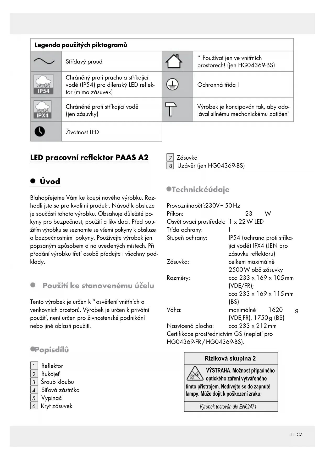 Uzávěr (jen HG04369-BS) Technické údaje Provozní napětí: 230 V∼ 50 Hz Příkon: 23 W Osvětlovací prostředek: 1 x 22 W LED Třída ochrany: I Stupeň ochrany: IP54 (ochrana proti stříka- jící vodě) IPX4 (JEN pro zásuvku reflektoru) Zásuvka: celkem maximálně 2500 W obě zásuvky Rozměry: cca 233 x 169 x 105 mm (VDE/FR); cca 233 x 169 x 115 mm (BS) Váha: maximálně 1620 g (VDE,FR), 1750 g (BS) Nasvícená plocha: cca 233 x 212 mm Certifikace prostřednictvím GS (neplatí pro HG04369-FR / HG04369-BS). Riziková skupina 2 Výrobek testován dle EN62471 VÝSTRAHA. Možnost případného optického záření vytvářeného tímto přístrojem. Nedívejte se do zapnuté lampy. Může dojít k poškození zraku.12 CZ Obsah dodávky Bezprostředně po vybalení zkontrolujte úplnost dodávky a bezvadný stav výrobku. 1 dílenský LED reflektor 1 návod kobsluze Všeobecná bezpečnostní upozornění PŘED PRVNÍM POUŽITÍM VÝROBKU SE SE- ZNAMTE SE VŠEMI BEZPEČNOSTNÍMI PO- KYNY A POKYNY K OBSLUZE! PŘI PŘEDÁVÁNÍ VÝROBKU TŘETÍ OSOBĚ PŘEDÁVEJTE SOUČASNĚ I VŠECHNY JEHO PODKLADY!