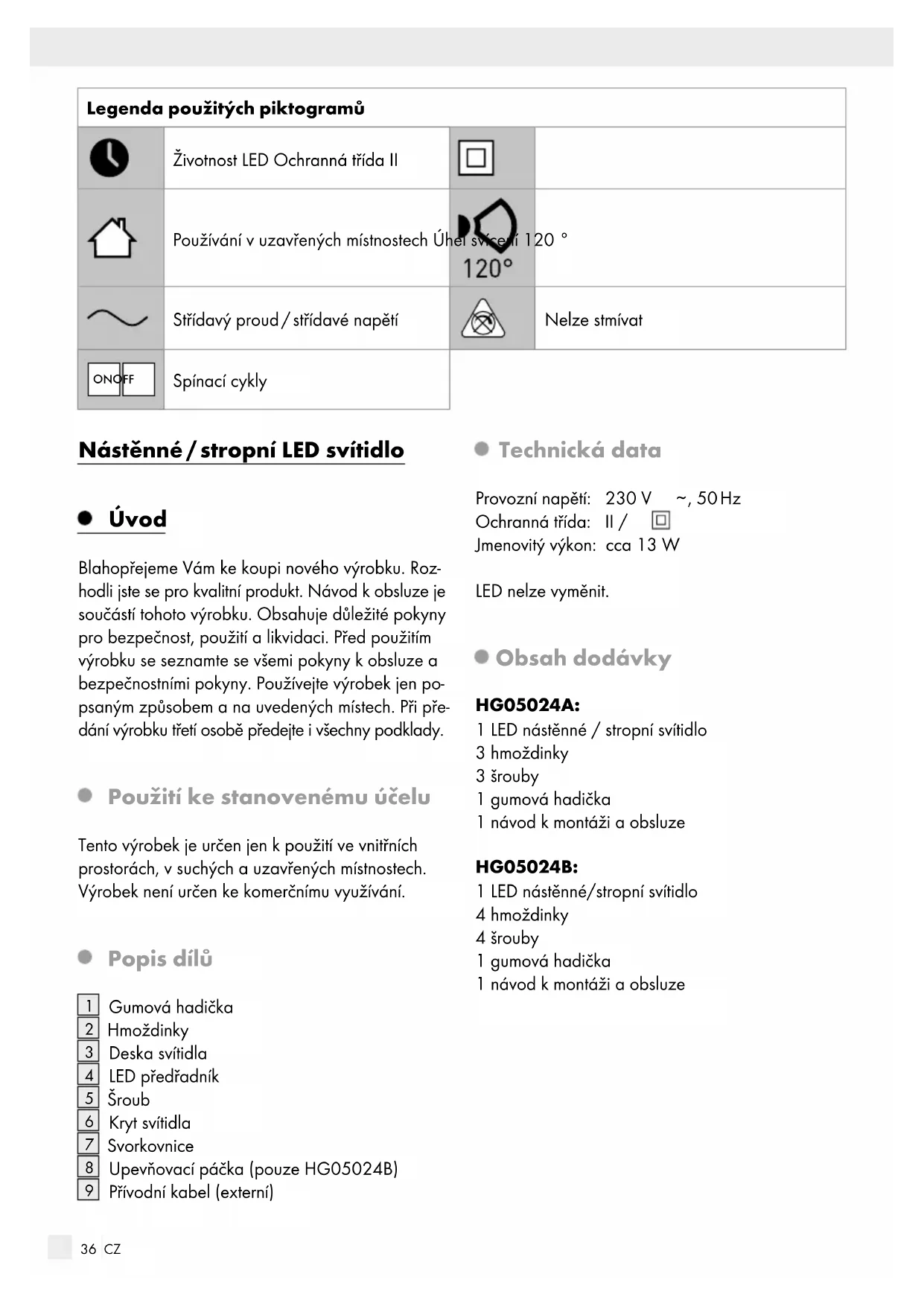 , 50 Hz Ochranná třída: II / Jmenovitý výkon: cca 13 W LED nelze vyměnit. Obsah dodávky HG05024A: 1 LED nástěnné / stropní svítidlo 3hmoždinky 3 šrouby 1 gumová hadička 1 návod k montáži a obsluze HG05024B: 1 LED nástěnné/stropní svítidlo 4hmoždinky 4 šrouby 1 gumová hadička 1 návod k montáži a obsluze37 CZ Bezpečnost Bezpečnostní pokyny PŘED POUŽITÍM ARTIKLU SI NEJDŘÍVE PŘEČTĚ- TE NÁVOD! USCHOVEJTE SI VŠECHNY BEZ- PEČNOSTNÍ UPOZORNĚNÍ A INSTRUKCE PRO BUDOUCNOST! NEBEZPEČÍ