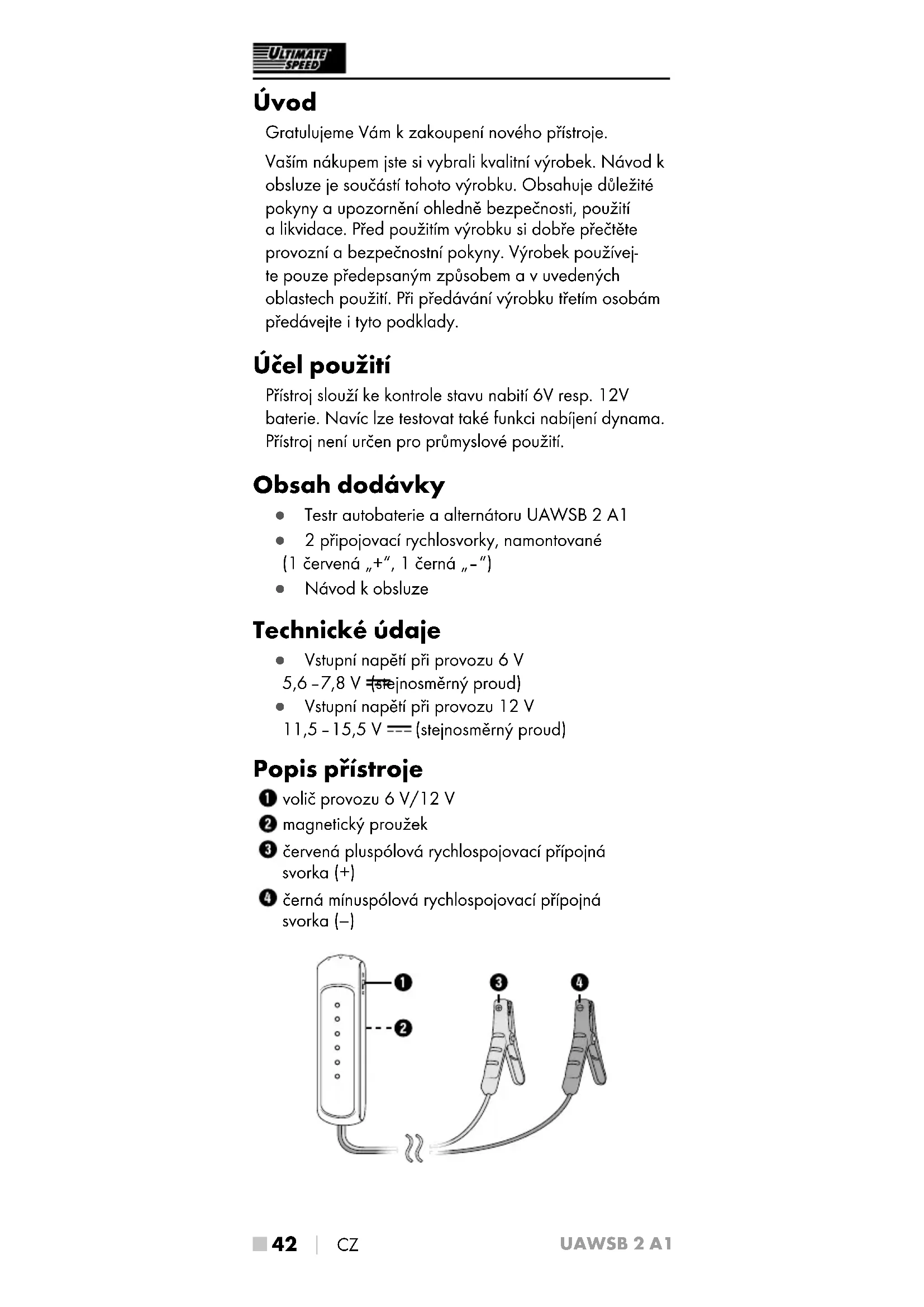 CZ Úvod Gratulujeme Vám k zakoupení nového přístroje. Vaším nákupem jste si vybrali kvalitní výrobek. Návod k obsluze je součástí tohoto výrobku. Obsahuje důležité pokyny a upozornění ohledně bezpečnosti, použití a likvidace. Před použitím výrobku si dobře přečtěte provozní a bezpečnostní pokyny. Výrobek používej- te pouze předepsaným způsobem a v uvedených oblastech použití. Při předávání výrobku třetím osobám předávejte i tyto podklady. Účel použití Přístroj slouží ke kontrole stavu nabití 6V resp. 12V baterie. Navíc lze testovat také funkci nabíjení dynama. Přístroj není určen pro průmyslové použití. Obsah dodávky ● Testr autobaterie a alternátoru UAWSB 2 A1 ● 2 připojovací rychlosvorky, namontované (1 červená „+“, 1 černá „–“) ● Návod k obsluze Technické údaje ● Vstupní napětí při provozu 6 V 5,6 –7,8 V (stejnosměrný proud) ● Vstupní napětí při provozu 12 V 11,5 –15,5 V (stejnosměrný proud) Popis přístroje volič provozu 6 V/12 V magnetický proužek červená pluspólová rychlospojovací přípojná svorka (+) černá mínuspólová rychlospojovací přípojná svorka (