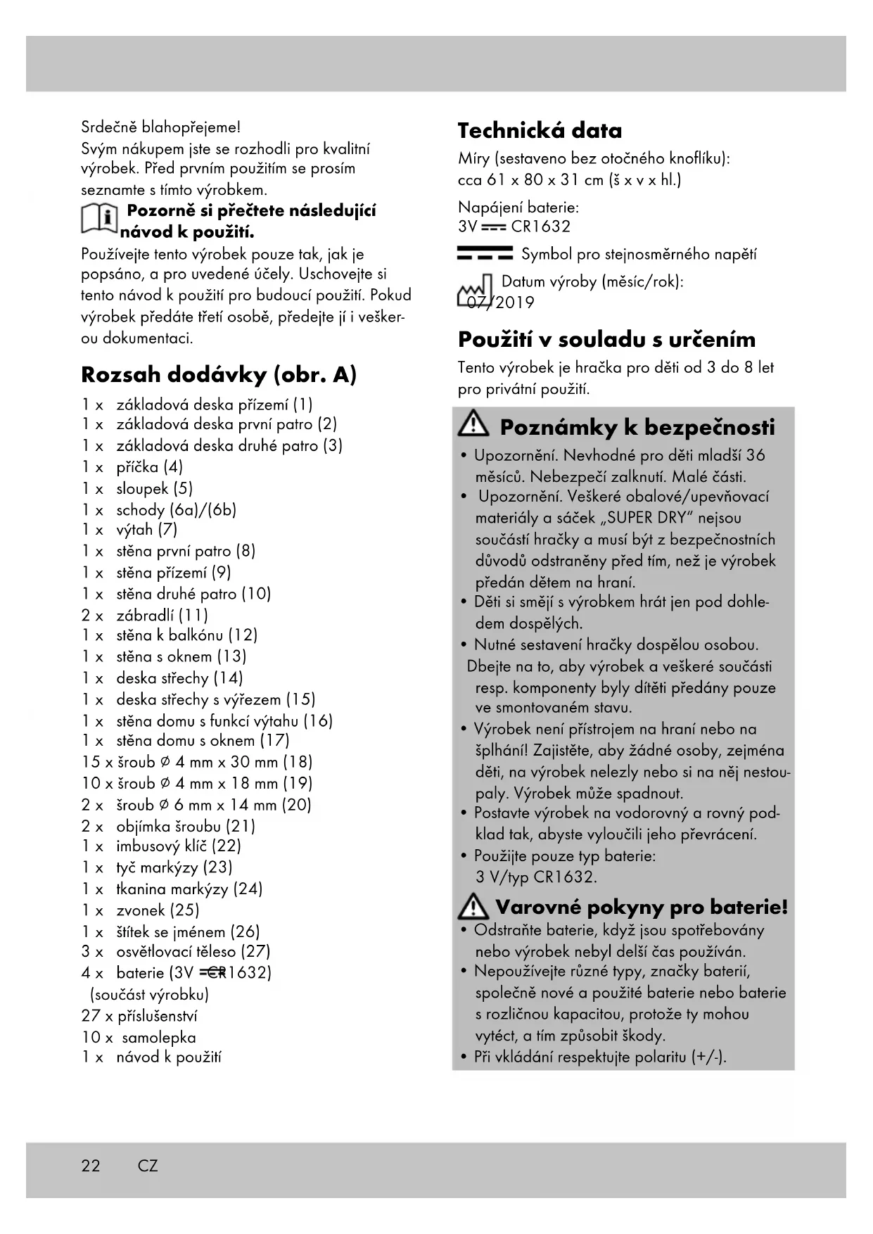 osvětlovacího tělesa (27) a upevněte zvonek resp. osvětlovací těleso zpátky na dům pane- nek.24 CZ Uskladnění, čištění Pokud výrobek nepoužíváte, skladujte jej vždy suchý, čistý, bez baterií a při pokojové teplotě. Utírejte pouze suchým hadříkem. DŮLEŽITÉ! K čištění nikdy nepoužívejte agresivní čisticí prostředky. Pokyny k likvidaci Výrobek a obalový materiál likvidujte do odpa- du podle aktuálních místních předpisů. Obalový materiál, jako např. fóliové sáčky, nepatří do dětských rukou. Obalový materiál uchovávejte z dosahu dětí. Zlikvidujte produkty a balení ekologicky. Recyklační kód identifikuje různé materiály pro recyklaci. Kód se skládá z recyklačního symbolu - který indikuje recyklační cyklus - a čísla identifikujícího materiál. Přístroje označené vedle stojícím sym- bolem, nesmí být likvidovány s domácím odpadem. Vaší povinností je takové staré elektrické a elektronické přístroje likvidovat zvlášť. Informujte se prosím na Vaší obci o možnostech řádné likvidace odpadu. Před likvidací do odpadu odstraňte z výrobku baterie. Likvidace baterií Respektujte prosím: že v případě baterií se jedná o zvláštní odpad, který se podle zákona nesmí likvidovat s domov- ním odpadem. Vysloužilé baterie můžete bezplatně odevzdat na sběrných místech ko- munálního odpadu nebo u obchodníka. Jsou zde k dispozici sběrné nádoby. Pokyny k záruce a průběhu služby Produkt byl vyrobený s velkou pečlivostí a byl průběžně kontrolovaný ve výrobní procesu. Na tento produkt obdržíte tříroční záruku ode dne zakoupení. Uschovejte si pokladní stvrzenku. Záruka se vztahuje jen na vady materiálu a chyby z výroby, nevztahuje se na závady způsobené neodborným zacházením nebo použitím k jinému účelu. Tato záruka neomezuje Vaše zákonná ani záruční práva. Při případných reklamacích se obraťte na dole uvedenou servisní horkou linku nebo nám zašlete email. Náš servisní pracovník s Vámi co nejrychleji upřesní další postup. V každém případě Vám osobně poradíme. Záruční doba se neprodlužuje po případných opravách v době záruky ani v případě zákon- ného ručení nebo kulance. Toto platí také pro náhradní a opravené díly. Opravy prováděné po vypršení záruční lhůty se platí. IAN: 321239_1901 Servis Česko Tel.: 800143873 E-Mail: deltasport@lidl.cz25 Blahoželáme! Svojím nákupom ste sa rozhodli pre kvalitný výrobok. Pred prvým použitím sa s výrobkom dôkladne oboznámte. Pozorne si prečítajte tento návod na použivanie. Výrobok používajte len uvedeným spôsobom a na uvedený účel. Tento návod na použivanie si dobre uschovajte. Pri odovzdávaní výrobku tretej osobe odovzdajte s výrobkom aj všetky podklady. Obsah balenia (obr. A) 1 x základová doska prízemie (1) 1 x základová doska prvé poschodie (2) 1 x základová doska druhé poschodie (3) 1 x deliaca stena (4) 1 x stĺp (5) 1 x schody (6a)/(6b) 1 x výťah (7) 1 x stena prvé poschodie (8) 1 x stena prízemie (9) 1 x stena druhé poschodie (10) 2 x zábradlie (11) 1 x stena ku balkónu (12) 1 x stena s oknom (13) 1 x strešný panel (14) 1 x strešný panel s otvorom (15) 1 x múr domu s konštrukciou pre výťah (16) 1 x múr domu s oknom (17) 15 x skrutka ∅ 4 mm x 30 mm (18) 10 x skrutka ∅ 4 mm x 18 mm (19) 2 x skrutka ∅ 6 mm x 14 mm (20) 2 x dutinka na skrutku (21) 1 x inbusový kľúč (22) 1 x tyč na markízu (23) 1 x plachta na markízu (24) 1 x zvonček (25) 1 x štítok s menom (26) 3 x svietidlo (27) 4 x batéria (3V CR1632) (je súčasťou výrobku) 27 x príslušenstvo 10 x nálepka 1 x navod na použivanie Technické údaje Rozmery (rozložený bez otočného spínača): cca. 61 x 80 x 31 cm (š x v x h) Zásobovanie energiou batérie: