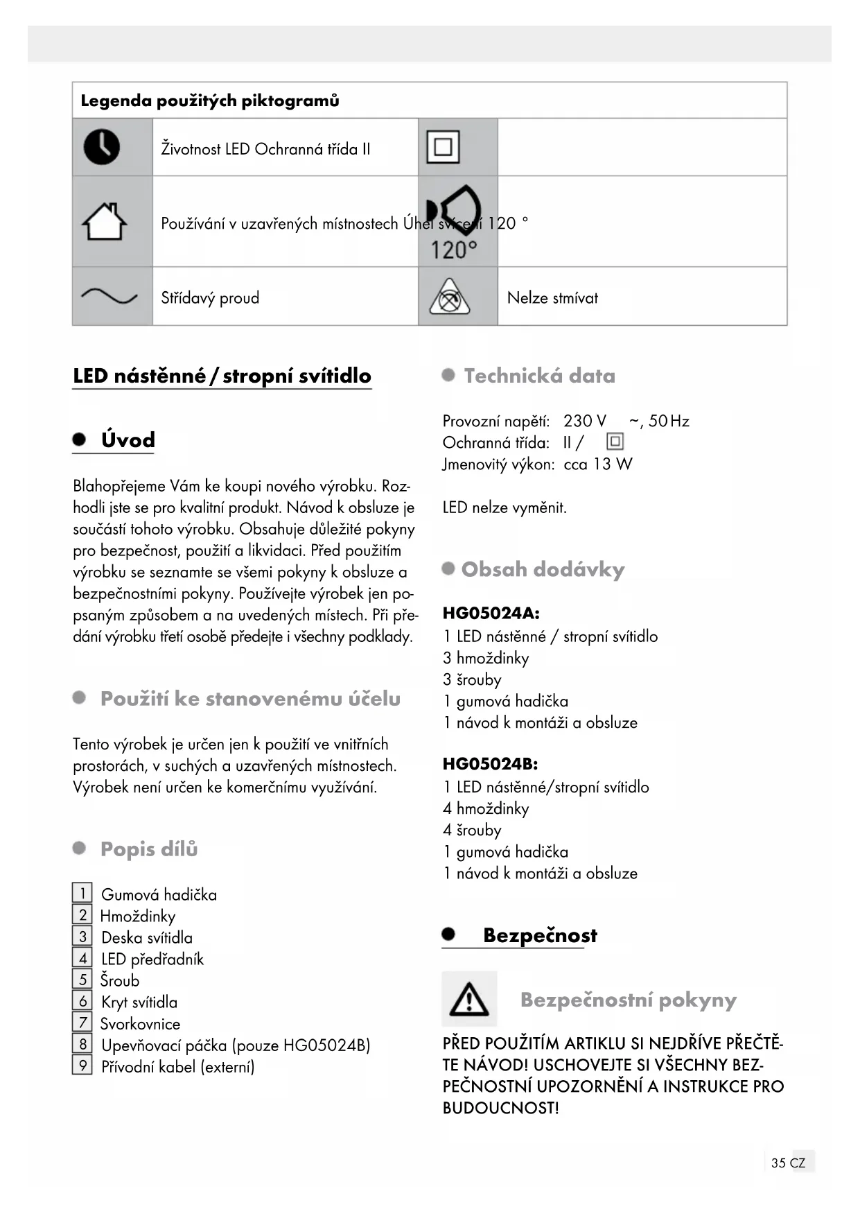 , 50 Hz Ochranná třída: II / Jmenovitý výkon: cca 13 W LED nelze vyměnit. Obsah dodávky HG05024A: 1 LED nástěnné / stropní svítidlo 3hmoždinky 3 šrouby 1 gumová hadička 1 návod k montáži a obsluze HG05024B: 1 LED nástěnné/stropní svítidlo 4hmoždinky 4 šrouby 1 gumová hadička 1 návod k montáži a obsluze Bezpečnost Bezpečnostní pokyny PŘED POUŽITÍM ARTIKLU SI NEJDŘÍVE PŘEČTĚ- TE NÁVOD! USCHOVEJTE SI VŠECHNY BEZ- PEČNOSTNÍ UPOZORNĚNÍ A INSTRUKCE PRO BUDOUCNOST!36 CZ NEBEZPEČÍ