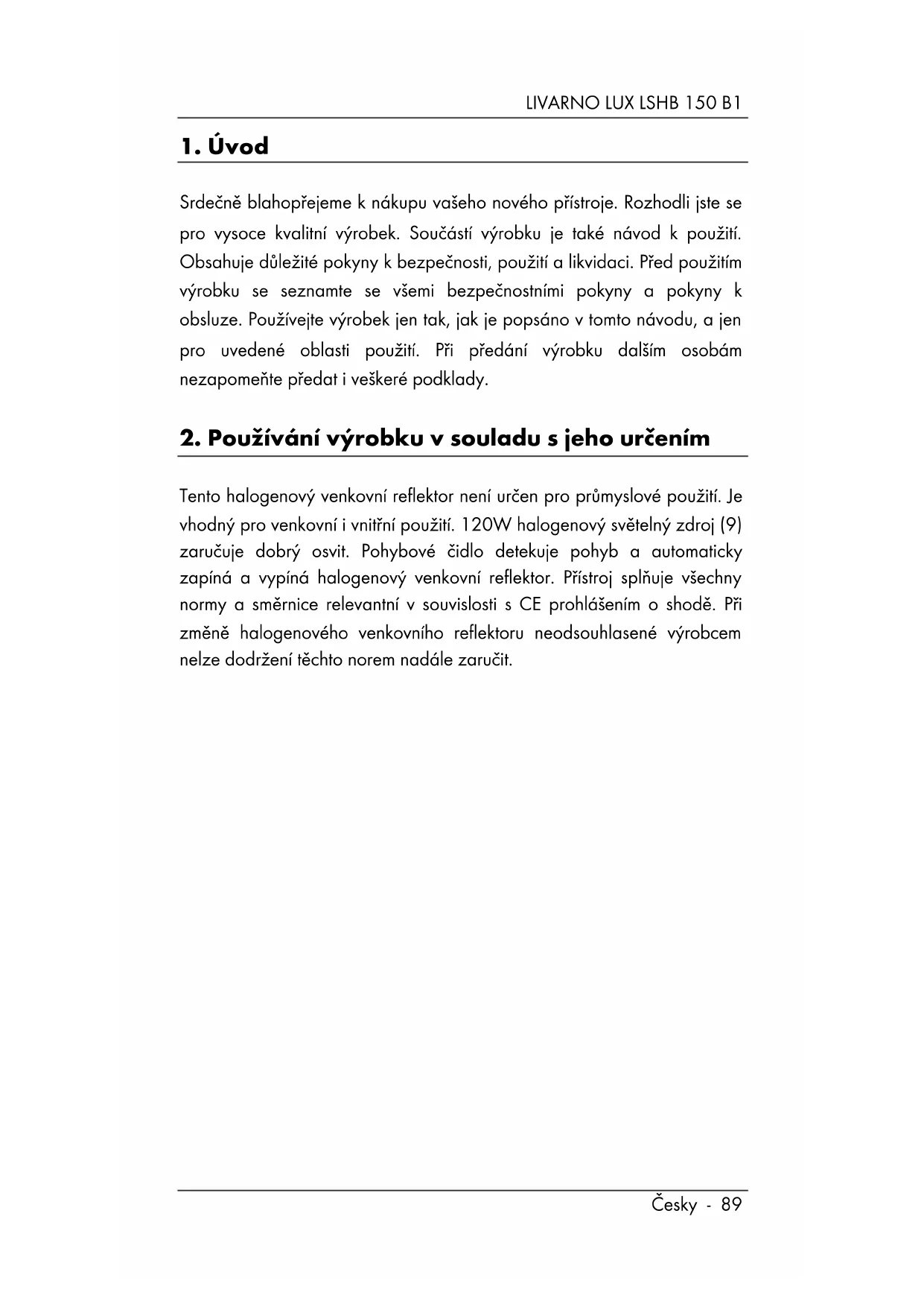 Před prvním použitím přístroje si pozorně přečtěte následující pokyny a dodržujte všechna výstražná upozornění, a to i tehdy, pokud jste se zacházením s elektronickými přístroji obeznámeni. Pečlivě tento návod k obsluze uschovejte pro pozdější použití. Pokud byste přístroj prodávali nebo předávali jiné osobě, nezapomeňte předat rovněž tento návod. Návod je nedílnou součástí přístroje. VAROVÁNÍ! Tento symbol označuje důležitá upozornění k bezpečnému provozu halogenového venkovního reflektoru a k ochraně uživatele. Nedodržení pokynů může vést ke vzniku věcných škod a/nebo ohrožení zdraví nebo dokonce smrtelnému úrazu osob. Nebezpečí požáru: Halogenový venkovní reflektor instalujte minimálně 1 metr od osvěcovaných materiálů. V důsledku nadměrného zahřívání může dojít ke vzniku požáru.LIVARNO LUX LSHB 150 B1 Česky - 93 Prasklý ochranný kryt je nutné vyměnit. Halogenový venkovní reflektor je vybaven přípojkou pro ochranný vodič. Ochranný vodič (žlutý/zelený) je nutné připojit k označené svorce.