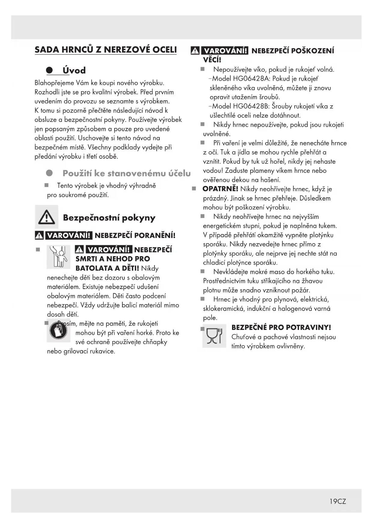 VĚCÍ! Nepoužívejte víko, pokud je rukojeť volná. – Model HG06428A: Pokud je rukojeť skleněného víka uvolněná, můžete ji znovu opravit utažením šroubů. – Model HG06428B: Šrouby rukojetí víka z ušlechtilé oceli nelze dotáhnout. Nikdy hrnec nepoužívejte, pokud jsou rukojeti uvolněné. Při vaření je velmi důležité, že nenecháte hrnce z očí. Tuk a jídla se mohou rychle přehřát a vznítit. Pokud by tuk už hořel, nikdy jej nehaste vodou! Zaduste plameny víkem hrnce nebo ověřenou dekou na hašení. OPATRNĚ! Nikdy neohřívejte hrnec, když je prázdný. Jinak se hrnec přehřeje. Důsledkem mohou být poškození výrobku. Nikdy neohřívejte hrnec na nejvyšším energetickém stupni, pokud je naplněna tukem. V případě přehřátí okamžitě vypněte plotýnku sporáku. Nikdy nezvedejte hrnec přímo z plotýnky sporáku, ale nejprve jej nechte stát na chladicí plotýnce sporáku. Nevkládejte mokré maso do horkého tuku. Prostřednictvím tuku stříkajícího na žhavou plotnu může snadno vzniknout požár. Hrnec je vhodný pro plynová, elektrická, sklokeramická, indukční a halogenová varná pole.