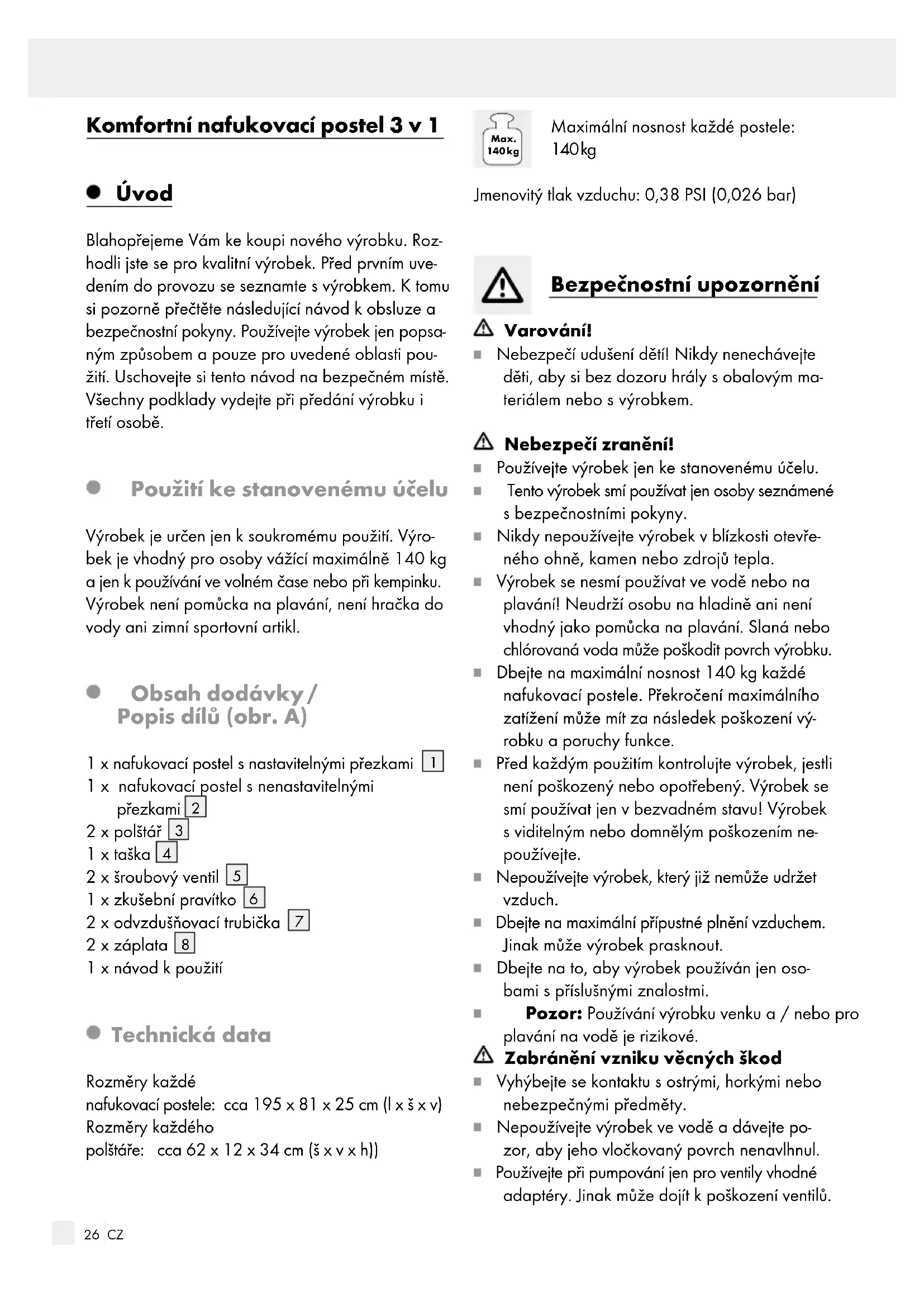 1 x návod kpoužití Technická data Rozměry každé nafukovací postele: cca 195 x 81 x 25 cm (l x š x v) Rozměry každého polštáře: cca 62 x 12 x 34 cm (š x v x h)) Max. 140 kg Maximální nosnost každé postele: 140 kg Jmenovitý tlak vzduchu: 0,38 PSI (0,026 bar) Bezpečnostní upozornění Varování! Nebezpečí udušení dětí! Nikdy nenechávejte děti, aby si bez dozoru hrály sobalovým ma- teriálem nebo svýrobkem. Nebezpečí zranění! Používejte výrobek jen ke stanovenému účelu. Tento výrobek smí používat jen osoby seznámené s bezpečnostními pokyny. Nikdy nepoužívejte výrobek vblízkosti otevře- ného ohně, kamen nebo zdrojů tepla. Výrobek se nesmí používat ve vodě nebo na plavání! Neudrží osobu na hladině ani není vhodný jako pomůcka na plavání. Slaná nebo chlórovaná voda může poškodit povrch výrobku. Dbejte na maximální nosnost 140 kg každé nafukovací postele. Překročení maximálního zatížení může mít za následek poškození vý- robku a poruchy funkce. Před každým použitím kontrolujte výrobek, jestli není poškozený nebo opotřebený. Výrobek se smí používat jen v bezvadném stavu! Výrobek s viditelným nebo domnělým poškozením ne- používejte. Nepoužívejte výrobek, který již nemůže udržet vzduch. Dbejte na maximální přípustné plnění vzduchem. Jinak může výrobek prasknout. Dbejte na to, aby výrobek používán jen oso- bami s příslušnými znalostmi. Pozor: Používání výrobku venku a / nebo pro plavání na vodě je rizikové. Zabránění vzniku věcných škod Vyhýbejte se kontaktu sostrými, horkými nebo nebezpečnými předměty. Nepoužívejte výrobek ve vodě a dávejte po- zor, aby jeho vločkovaný povrch nenavlhnul. Používejte při pumpování jen pro ventily vhodné adaptéry. Jinak může dojít kpoškození ventilů.27 CZ Výrobek reaguje na chlad a horko. Nepouží- vejte proto výrobek při venkovních teplotách nižších než 15°C nebo nad 40°C. Jinak může dojít kpoškození výrobku. Po napumpování ventily dobře uzavřete. Montování šroubových ventilů (obr. B) Každá z obou nafukovacích postelí