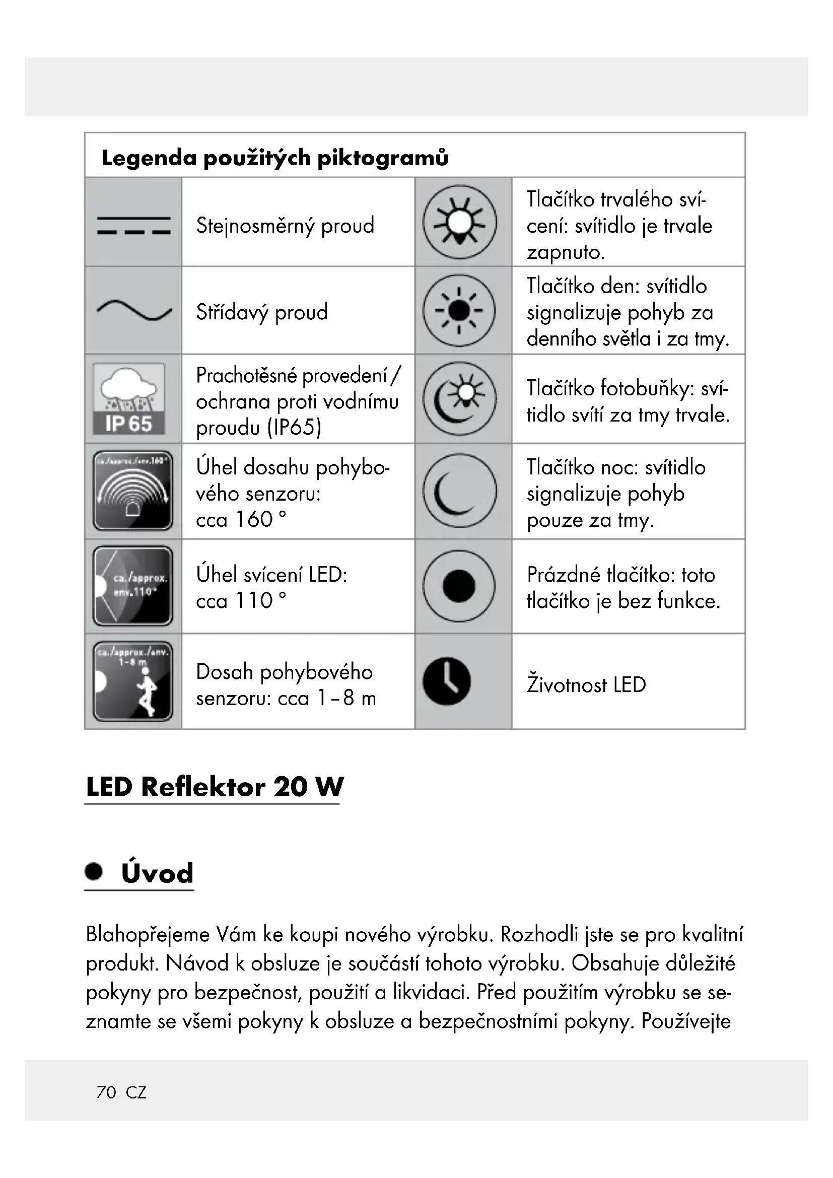 rachotěsné provede ní / ochrana proti vodnímu proudu (IP65) Tlačítko fotobuňky: sví- tidlo svítí za tmy trvale. Úhel dosahu pohybo- vého senzoru: cca 160 ° Tlačítko noc: svítidlo signalizuje pohyb pouze za tmy. Úhel svícení LED: cca 110 ° Prázdné tlačítko: toto tlačítko je bez funkce. Dosah pohybového senzoru: cca 1–8m Životnost LED LED Reflektor 20 W Úvod Blahopřejeme Vám ke koupi nového výrobku. Rozhodli jste se pro kvalitní produkt. Návod kobsluze je součástí tohoto výrobku. Obsahuje důležité pokyny pro bezpečnost, použití a likvidaci. Před použitím výrobku se se- znamte se všemi pokyny k obsluze a bezpečnostními pokyny. Používejte71 CZ výrobek jen popsaným způsobem a na uvedených místech. Při předání výrobku třetí osobě předejte i všechny podklady. Použití ke stanovenému účelu Tento výrobek je určen kosvětlení vnitřních a venkovních prostor. Výrobek je určen ksoukromému použití, není určen kživnostenskému podnikání nebo pro jinou oblast využití. Popis dílů
