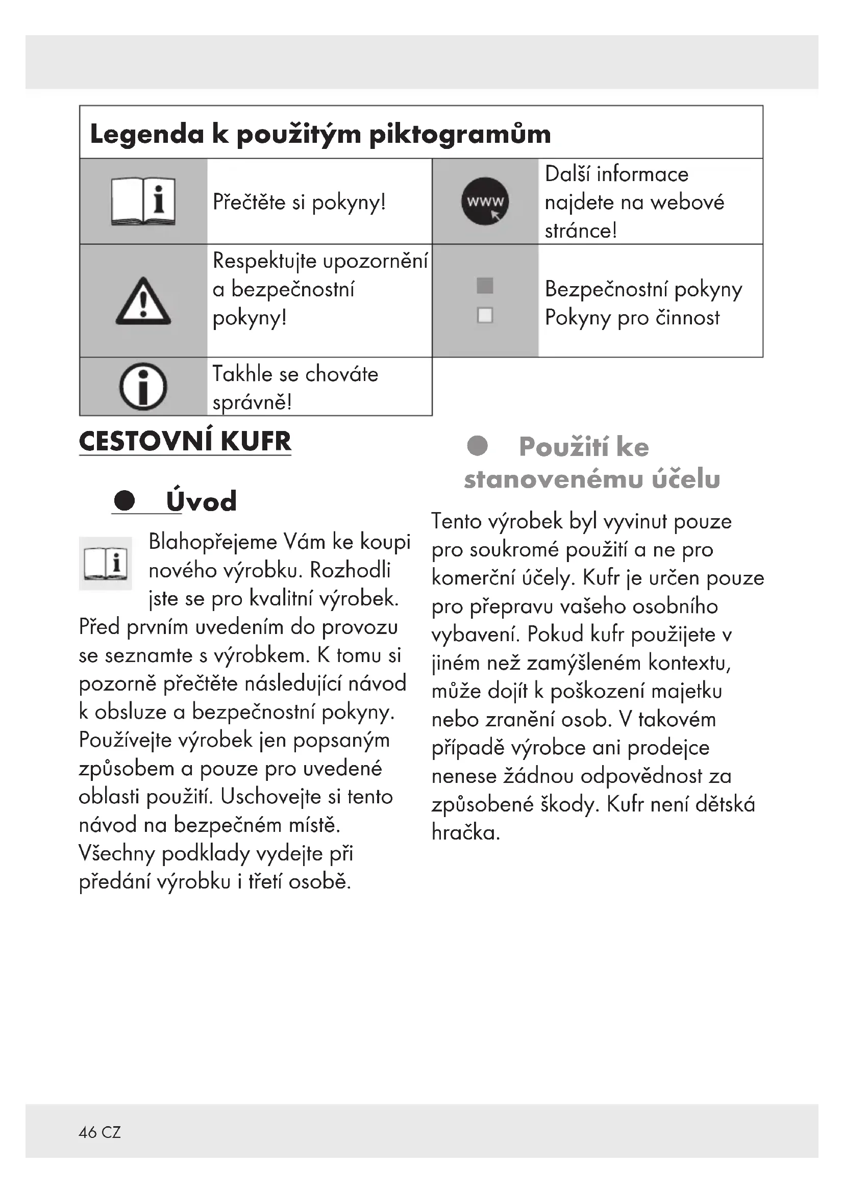 ID ........................... Strana 49 Postup .................................................. Strana 49 Skladování............................................. Strana 49 Čištění .................................................. Strana 49 Zlikvidování ........................................... Strana 50 Záruka ................................................. Strana 50 Postup v případě uplatňování záruky .......................... Strana 51 Servis................................................... Strana 5146 CZ Legenda k použitým piktogramům Přečtěte si pokyny! Další informace najdete na webové stránce! Respektujte upozornění a bezpečnostní pokyny! Bezpečnostní pokyny Pokyny pro činnost Takhle se chováte správně! CESTOVNÍ KUFR Úvod Blahopřejeme Vám ke koupi nového výrobku. Rozhodli jste se pro kvalitní výrobek. Před prvním uvedením do provozu se seznamte s výrobkem. K tomu si pozorně přečtěte následující návod k obsluze a bezpečnostní pokyny. Používejte výrobek jen popsaným způsobem a pouze pro uvedené oblasti použití. Uschovejte si tento návod na bezpečném místě. Všechny podklady vydejte při předání výrobku i třetí osobě. Použití ke stanovenému účelu Tento výrobek byl vyvinut pouze pro soukromé použití a ne pro komerční účely. Kufr je určen pouze pro přepravu vašeho osobního vybavení. Pokud kufr použijete v jiném než zamýšleném kontextu, může dojít k poškození majetku nebo zranění osob. V takovém případě výrobce ani prodejce nenese žádnou odpovědnost za způsobené škody. Kufr není dětská hračka.47CZ Popis dílů [1] Rukojeť [2] Teleskopická tyč [3] Kombinační zámek Travel Sentry