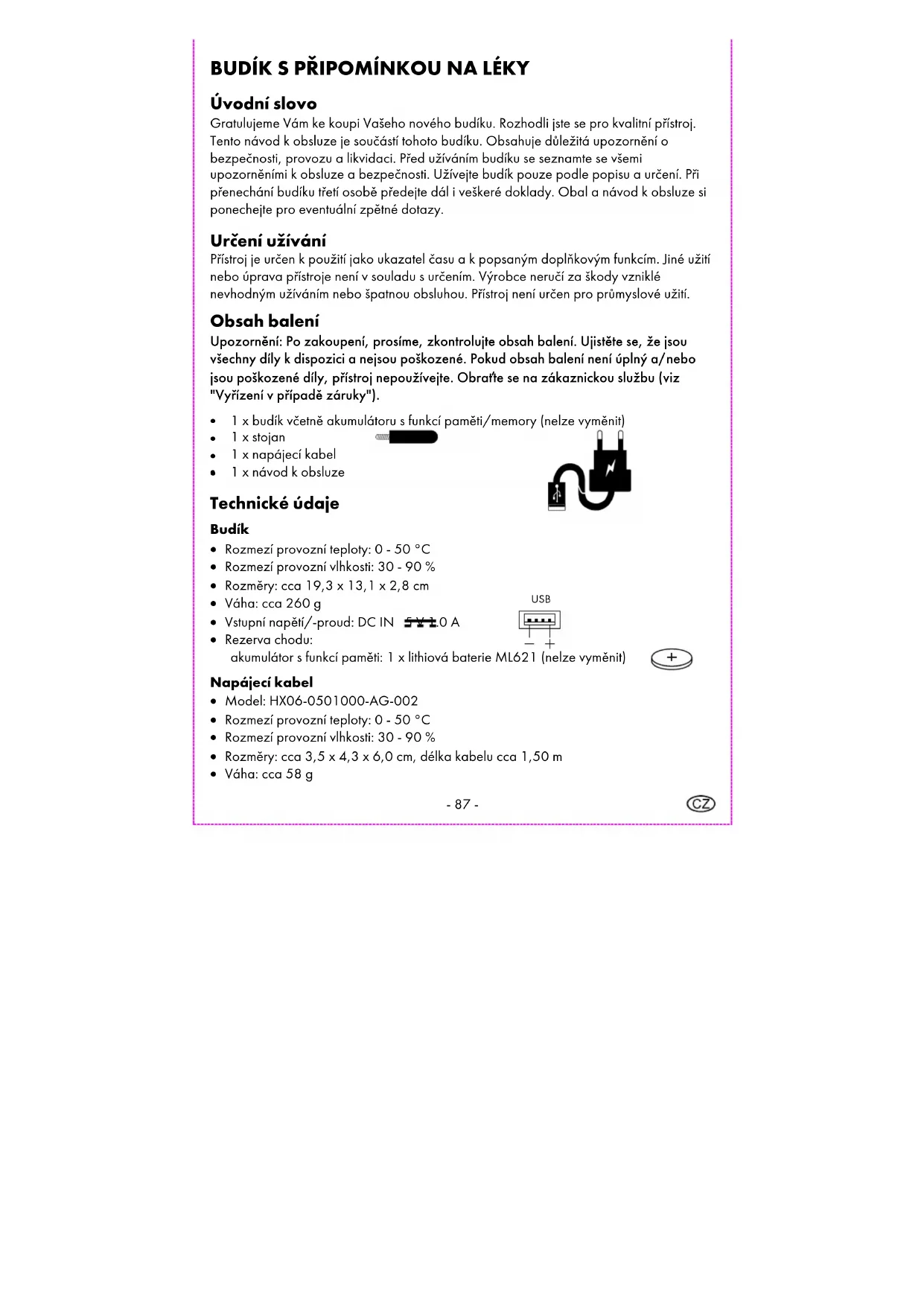 1 x návod k obsluze Technické údaje Budík Rozmezí provozní teploty: 0 - 50 °C Rozmezí provozní vlhkosti: 30 - 90 % Rozměry: cca 19,3 x 13,1 x 2,8 cm Váha: cca 260 g Vstupní napětí/-proud: DC IN 5 V 1.0 A Rezerva chodu: akumulátor s funkcí paměti: 1 x lithiová baterie ML621 (nelze vyměnit) Napájecí kabel Model: HX06-0501000-AG-002 Rozmezí provozní teploty: 0 - 50 °C Rozmezí provozní vlhkosti: 30 - 90 % Rozměry: cca 3,5 x 4,3 x 6,0 cm, délka kabelu cca 1,50 m Váha: cca 58 g USB- 88 - Vstupní napětí: 100 - 240 V Frekvence vstupního střídavého proudu: 50/60 Hz Vstupní proud : 1.0 A Max. Napětí výstupu: 5,0 V DC/stejnosměrný proud Proud výstupu: 1,0 A Výkon výstupu: 5,0 W Průměrná výkonnost v provozu: 73,62 % Výkonný příkon při nulovém zatížení: 0,1 W Max. Ochranná třída: II Bezpečnost, kontrolováno S 50477229 0001 Deklarace symbolů