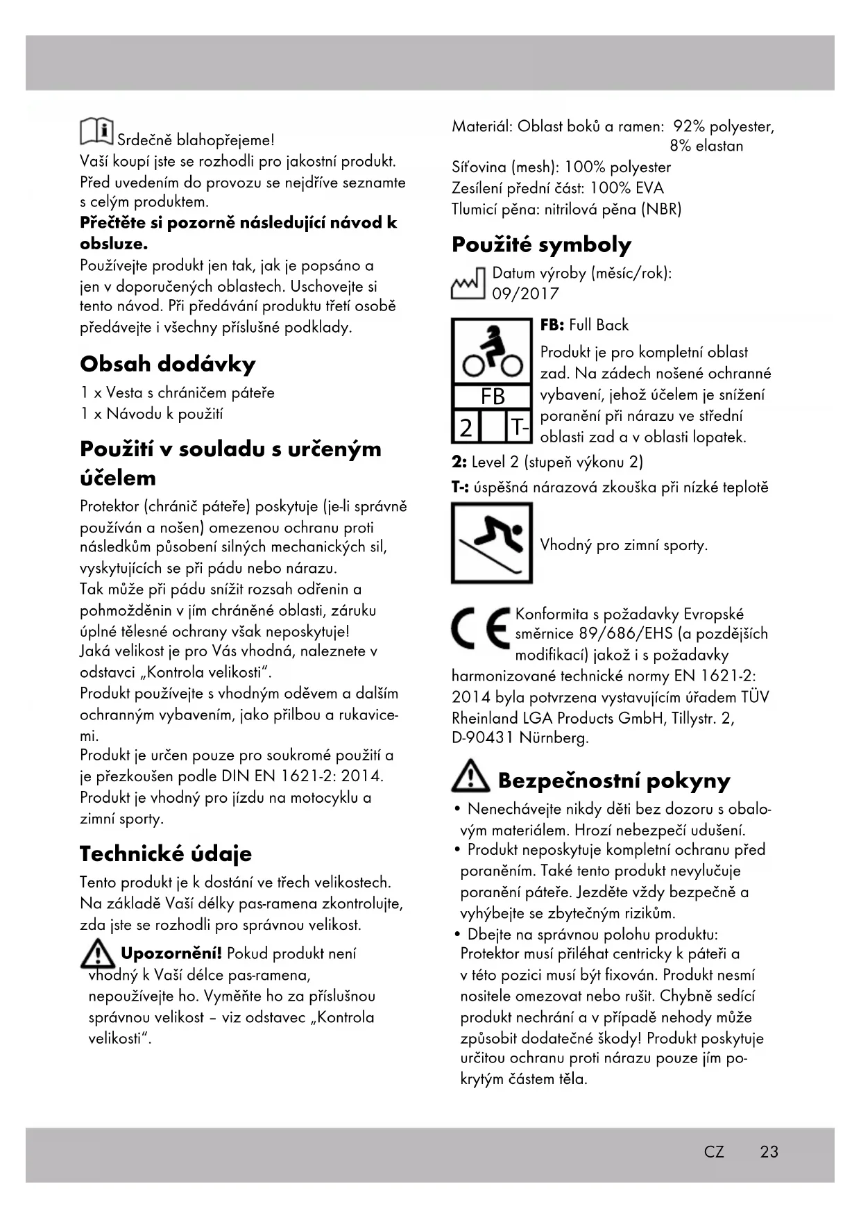 - Dbejte na správnou polohu produktu: Protektor musí přiléhat centricky k páteři a v této pozici musí být fixován. Produkt nesmí nositele omezovat nebo rušit. Chybně sedící produkt nechrání a v případě nehody může způsobit dodatečné škody! Produkt poskytuje určitou ochranu proti nárazu pouze jím po- krytým částem těla. Srdečně blahopřejeme! Vaší koupí jste se rozhodli pro jakostní produkt. Před uvedením do provozu se nejdříve seznamte s celým produktem. Přečtěte si pozorně následující návod k obsluze. Používejte produkt jen tak, jak je popsáno a jen v doporučených oblastech. Uschovejte si tento návod. Při předávání produktu třetí osobě předávejte i všechny příslušné podklady. Obsah dodávky 1 x Vesta s chráničem páteře 1 x Návodu k použití Použití v souladu s určeným účelem Protektor (chránič páteře) poskytuje (je-li správně používán a nošen) omezenou ochranu proti následkům působení silných mechanických sil, vyskytujících se při pádu nebo nárazu. Tak může při pádu snížit rozsah odřenin a pohmožděnin v jím chráněné oblasti, záruku úplné tělesné ochrany však neposkytuje! Jaká velikost je pro Vás vhodná, naleznete v odstavci „Kontrola velikosti“. Produkt používejte s vhodným oděvem a dalším ochranným vybavením, jako přilbou a rukavice- mi. Produkt je určen pouze pro soukromé použití a je přezkoušen podle DIN EN 1621-2: 2014. Produkt je vhodný pro jízdu na motocyklu a zimní sporty. Technické údaje Tento produkt je k dostání ve třech velikostech. Na základě Vaší délky pas-ramena zkontrolujte, zda jste se rozhodli pro správnou velikost. Upozornění! Pokud produkt není vhodný k Vaší délce pas-ramena, nepoužívejte ho. Vyměňte ho za příslušnou správnou velikost – viz odstavec „Kontrola velikosti“. CZ24