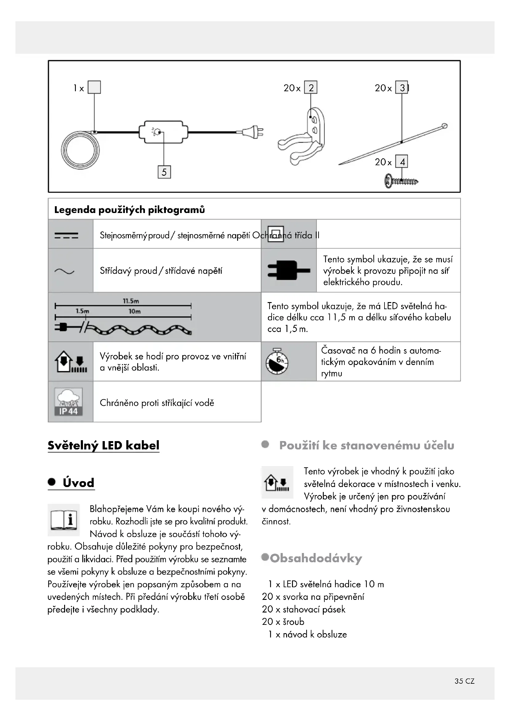 na czym polega wada i kiedy wystąpiła, przesłać bezpłatnie na podany Państwu adres serwisu. Serwis Serwis Polska Tel.: 008004911946 E-Mail: owim@lidl.pl34 CZ Legenda použitých piktogramů ...............................................................................Strana 35 Úvod .................................................................................................................................................Strana 35 Použití ke stanovenému účelu..........................................................................................................Strana 35 Obsah dodávky ............................................................................................................................... Strana 35 Popis dílů ..........................................................................................................................................Strana 36 Technické údaje ...............................................................................................................................Strana 36 Bezpečnostní upozornění ...............................................................................................Strana 36 Bezpečnostní upozornění kmontáži ...............................................................................................Strana 37 Montáž ........................................................................................................................................... Strana 37 Použití .............................................................................................................................................Strana 37 Použití časovače .....................................................................................................................Strana 38 Čistění a ošetřování .............................................................................................................Strana 38 Skladování ..................................................................................................................................Strana 38 Zlikvidování ...............................................................................................................................Strana 38 Záruka ............................................................................................................................................Strana 38 Postup v případě uplatňování záruky ............................................................................................. Strana 39 Servis .................................................................................................................................................Strana 3935 CZ Legenda použitých piktogramů Stejnosměrný proud / stejnosměrné napětí Ochranná třída II Střídavý proud / střídavé napětí Tento symbol ukazuje, že se musí výrobek k provozu připojit na síť elektrického proudu. Tento symbol ukazuje, že má LED světelná ha- dice délku cca 11,5 m a délku síťového kabelu cca 1,5 m. Výrobek se hodí pro provoz ve vnitřní a vnější oblasti. Časovač na 6hodin sautoma- tickým opakováním vdenním rytmu Chráněno proti stříkající vodě Světelný LED kabel Úvod Blahopřejeme Vám ke koupi nového vý- robku. Rozhodli jste se pro kvalitní produkt. Návod kobsluze je součástí tohoto vý- robku. Obsahuje důležité pokyny pro bezpečnost, použití a likvidaci. Před použitím výrobku se seznamte se všemi pokyny k obsluze a bezpečnostními pokyny. Používejte výrobek jen popsaným způsobem a na uvedených místech. Při předání výrobku třetí osobě předejte i všechny podklady. Použití ke stanovenému účelu Tento výrobek je vhodný k použití jako světelná dekorace v místnostech i venku. Výrobek je určený jen pro používání vdomácnostech, není vhodný pro živnostenskou činnost. Obsah dodávky 1 x LED světelná hadice 10 m 20 x svorka na připevnění 20 x stahovací pásek 20 x šroub 1 x návod k obsluze