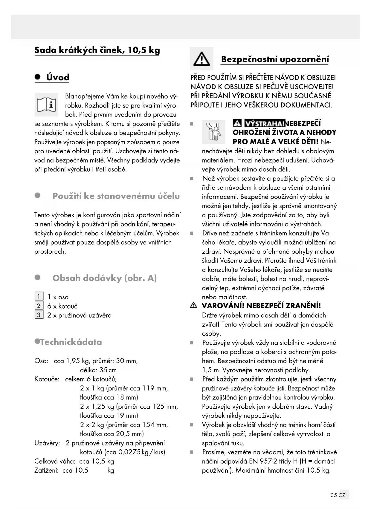 PRO MALÉ A VELKÉ DĚTI! Ne- nechávejte děti nikdy bez dohledu sobalovým materiálem. Hrozí nebezpečí udušení. Uchová- vejte výrobek mimo dosah dětí. Než výrobek sestavíte a použijete přečtěte si a řiďte se návodem k obsluze a všemi ostatními informacemi. Bezpečné používání výrobku je možné jen tehdy, jestliže je správně smontovaný a používaný. Jste zodpovědní za to, aby byli všichni uživatelé informováni o výstrahách. Dříve než začnete s tréninkem konzultujte Va- šeho lékaře, abyste vyloučili možná ublížení na zdraví. Nesprávné a přehnané pohyby mohou škodit Vašemu zdraví. Přerušte ihned Váš trénink a konzultujte Vašeho lékaře, jestliže se necítíte dobře, máte bolesti, bolest na hrudi, nepravi- delný tep, extrémní dýchací potíže, závratě nebo malátnost. VAROVÁNÍ! NEBEZPEČÍ ZRANĚNÍ! Držte výrobek mimo dosah dětí a domácích zvířat! Tento výrobek smí používat jen dospělé osoby. Používejte výrobek vždy na stabilní a vodorovné ploše, na podlaze a koberci s ochranným pota- hem. Bezpečnostní odstup má být nejméně 1,5 m. Vyrovnejte nerovnosti podlahy. Před každým použitím zkontrolujte, jestli všechny pružinové uzávěry kotouče jistí. Bezpečnost může být zajištěná jen pravidelnou kontrolou výrobku. Používejte výrobek jen v dobrém stavu. Vadný výrobek nikdy nepoužívejte. Výrobek je obzvlášť vhodný na trénink horní části těla, svalů paží, zlepšení celkové vytrvalosti a spalování tuku. Prosíme, vezměte na vědomí, že toto tréninkové náčiní odpovídá EN 957-2 třídy H (H = domácí používání). Maximální hmotnost činí 10,5 kg.36 CZ Toto tréninkové náčiní podle DIN EN ISO 20957-1 není vhodné pro mladistvé do 14 let. Rodiče a jiné osoby, kterým je svěřen dozor, si musejí být vědomi své odpovědnosti, protože zdůvodu přirozené dětské hravosti a touhy po poznávání je nutné počítat stakovými situacemi a chováním, pro které není tréninkové náčiní konstruováno. Pokud umožníte dětem výrobek používat, musíte vzít vúvahu jejich duševní a tělesný vývoj a především jejich temperament. Na děti byste měli dohlížet a především jim ukázat správné zacházení s výrobkem. Tréninkové náčiní není vhodné na hraní. Montáž Nasuňte kotouče
