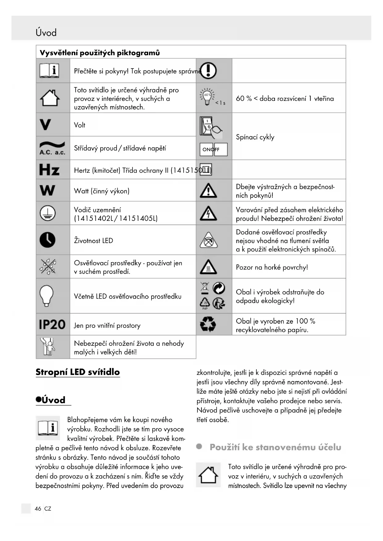 PAP Obal i výrobek odstraňujte do odpadu ekologicky! Jen pro vnitřní prostory Obal je vyroben ze 100 % recyklovatelného papíru. Nebezpečí ohrožení života a nehody malých i velkých dětí! Stropní LED svítidlo Úvod Blahopřejeme vám ke koupi nového výrobku. Rozhodli jste se tím pro vysoce kvalitní výrobek. Přečtěte si laskavě kom- pletně a pečlivě tento návod k obsluze. Rozevřete stránku sobrázky. Tento návod je součástí tohoto výrobku a obsahuje důležité informace k jehouve- dení do provozu a kzacházení sním. Řiďte se vždy bezpečnostními pokyny. Před uvedením do provozu zkontrolujte, jestli je kdispozici správné napětí a jestli jsou všechny díly správně namontované. Jest- liže máte ještě otázky nebo jste si nejistí při ovládání přístroje, kontaktujte vašeho prodejce nebo servis. Návod pečlivě uschovejte a případně jej předejte třetí osobě. Použití ke stanovenému účelu Toto svítidlo je určené výhradně pro pro- voz vinteriéru, vsuchých a uzavřených místnostech. Svítidlo lze upevnit na všechny Úvod / Bezpečnost47 CZ Úvod Úvod / Bezpečnost běžně hořlavé povrchy. Tento přístroj je určen pouze k použití v domácnosti. Tento výrobek je určen jen k normálnímu provozu. Obsah dodávky Bezprostředně po vybalení vždy zkontrolujte úplnost dodávky a bezvadný stav zařízení. 1 stropní LED svítidlo, model 14151402L / 14151405L / 14151501L 2 šrouby (montážní úhelník) 2 hmoždinek 2 ochranné hadičky (14151402L / 14151405L) 1gumová průchodka (14151501L) 3 LED osvětlovací prostředek 1 návod kmontáži a použití Popis dílů