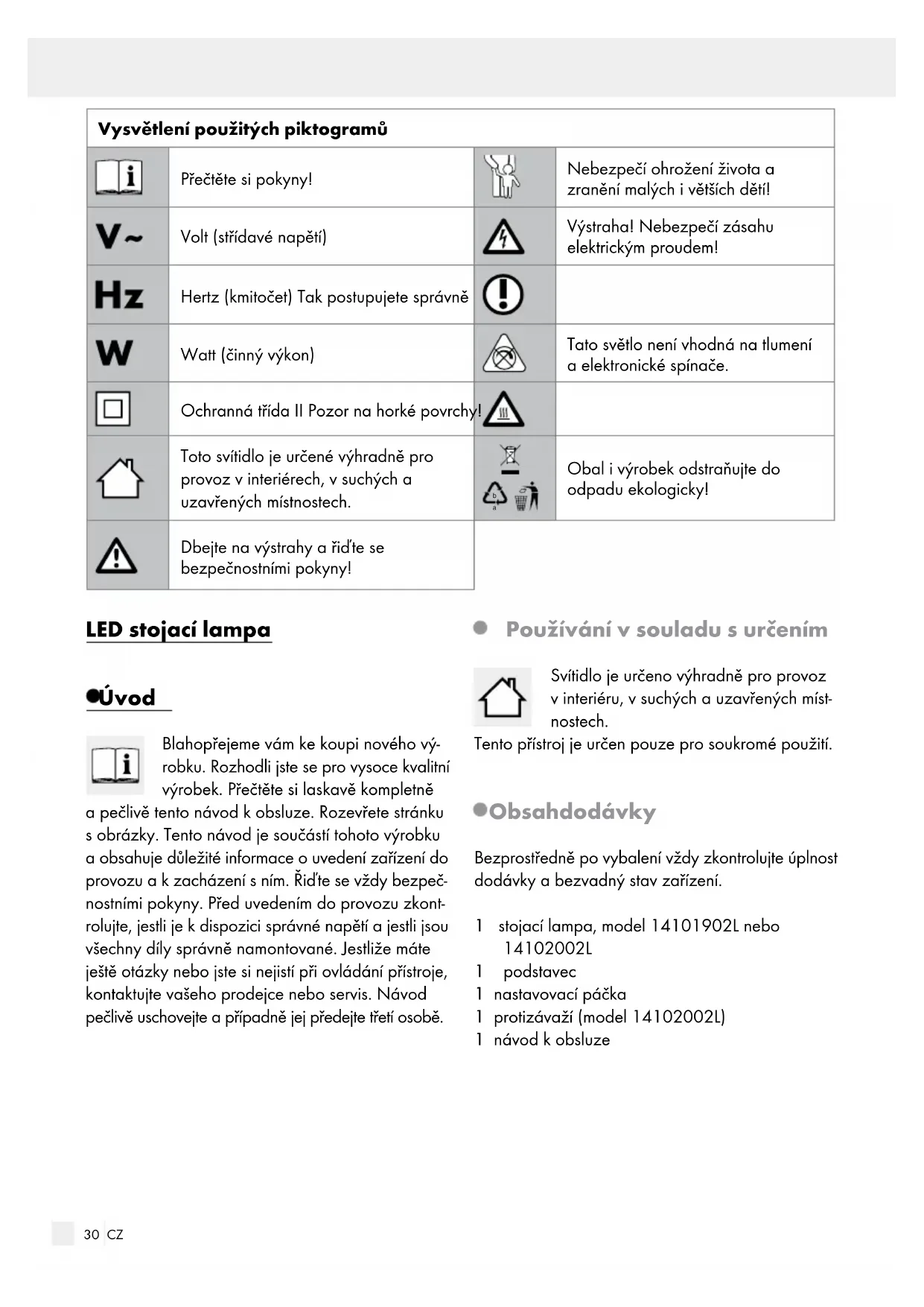 Obal i výrobek odstraňujte do odpadu ekologicky! Dbejte na výstrahy a řiďte se bezpečnostními pokyny! LED stojací lampa Úvod Blahopřejeme vám ke koupi nového vý- robku. Rozhodli jste se pro vysoce kvalitní výrobek. Přečtěte si laskavě kompletně a pečlivě tento návod k obsluze. Rozevřete stránku sobrázky. Tento návod je součástí tohoto výrobku a obsahuje důležité informace ouvedení zařízení do provozu a kzacházení sním. Řiďte se vždy bezpeč- nostními pokyny. Před uvedením do provozu zkont- rolujte, jestli je kdispozici správné napětí a jestli jsou všechny díly správně namontované. Jestliže máte ještě otázky nebo jste si nejistí při ovládání přístroje, kontaktujte vašeho prodejce nebo servis. Návod pečlivě uschovejte a případně jej předejte třetí osobě. Používání v souladu s určením Svítidlo je určeno výhradně pro provoz vinteriéru, vsuchých a uzavřených míst- nostech. Tento přístroj je určen pouze pro soukromé použití. Obsah dodávky Bezprostředně po vybalení vždy zkontrolujte úplnost dodávky a bezvadný stav zařízení. 1 stojací lampa, model 14101902L nebo 14102002L 1 podstavec 1 nastavovací páčka 1 protizávaží (model 14102002L) 1 návod kobsluze31 CZ Úvod / Bezpečnost Úvod Popis dílů