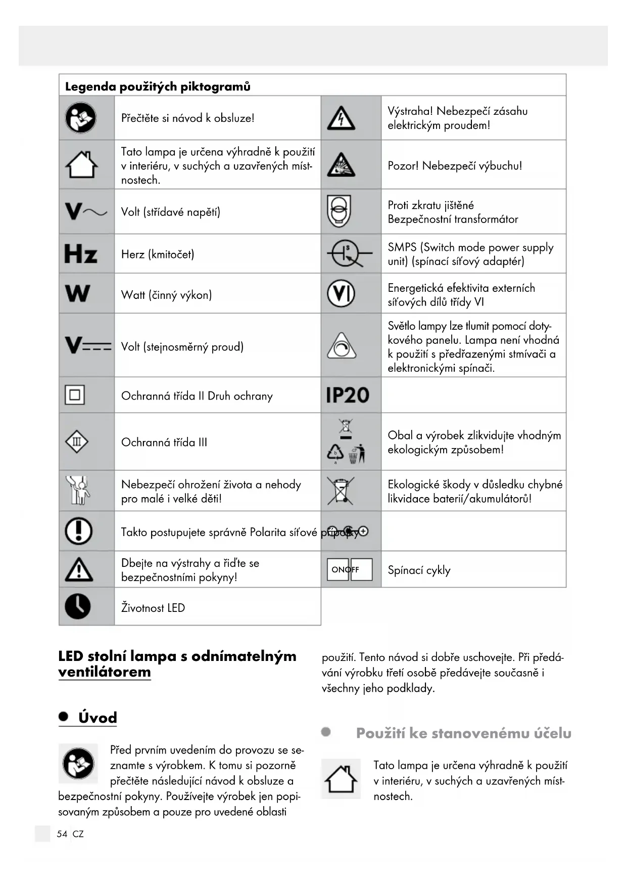 Obal a výrobek zlikvidujte vhodným ekologickým způsobem! Nebezpečí ohrožení života a nehody pro malé i velké děti! Ekologické škody vdůsledku chybné likvidace baterií/akumulátorů! Takto postupujete správně Polarita síťové přípojky Dbejte na výstrahy a řiďte se bezpečnostními pokyny! ON OFF Spínací cykly Životnost LED LED stolní lampa s odnímatelným ventilátorem Úvod Před prvním uvedením do provozu se se- znamte s výrobkem. Ktomu si pozorně přečtěte následující návod kobsluze a bezpečnostní pokyny. Používejte výrobek jen popi- sovaným způsobem a pouze pro uvedené oblasti použití. Tento návod si dobře uschovejte. Při předá- vání výrobku třetí osobě předávejte současně i všechny jeho podklady. Použití ke stanovenému účelu Tato lampa je určena výhradně kpoužití vinteriéru, vsuchých a uzavřených míst- nostech.55 CZ Používejte výrobek jen v návodu k obsluze popsa- ným způsobem. Každé jiné použití je použitím k nestanovenému účelu může vést k věcným škodám nebo dokonce k ohrožení osob. Výrobek není hrač ka. Za škody vzniklé použitím k jinému, než ke stanove- nému účelu, výrobce neručí. Obsah dodávky 1 stolní LED lampa s odnímatelným ventilátorem, model 55399 1 síťový adaptér 1 micro USB kabel 1 návod kobsluze Popis dílů